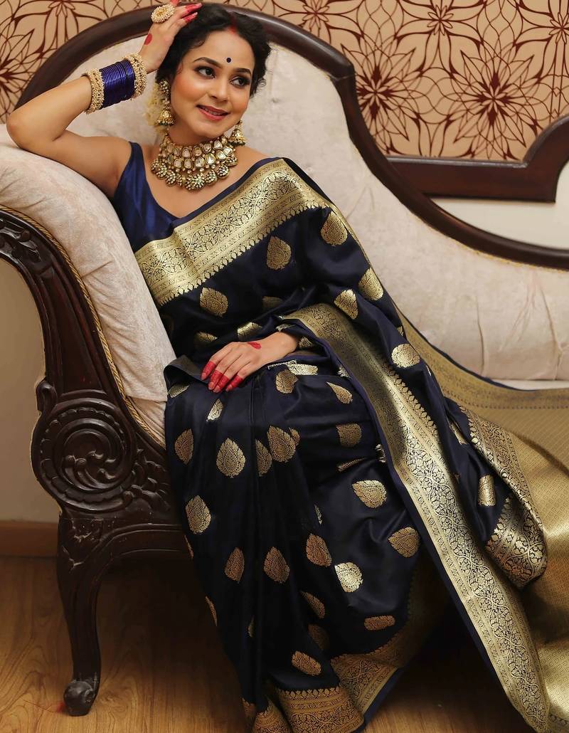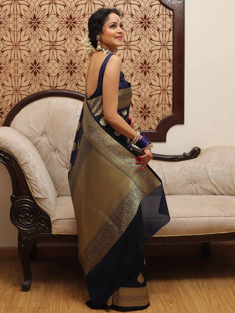 Blue soft silk blend banarasi jacuard work designer party wear saree with unstitched blouse piece