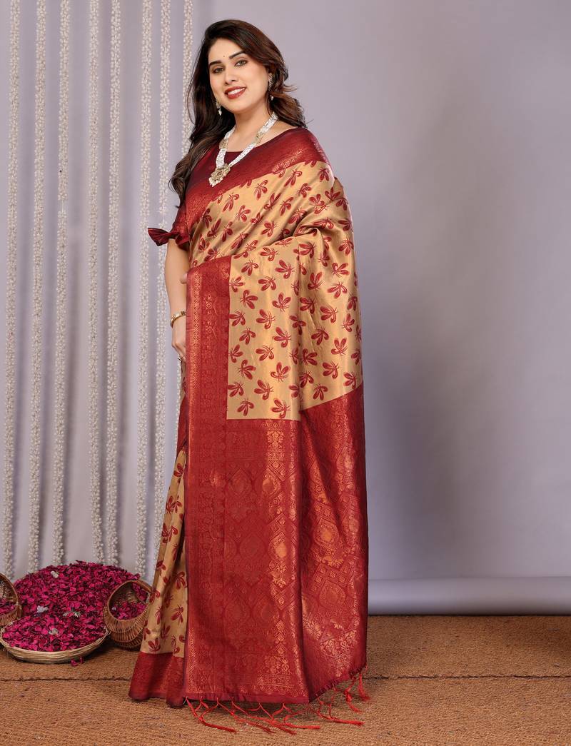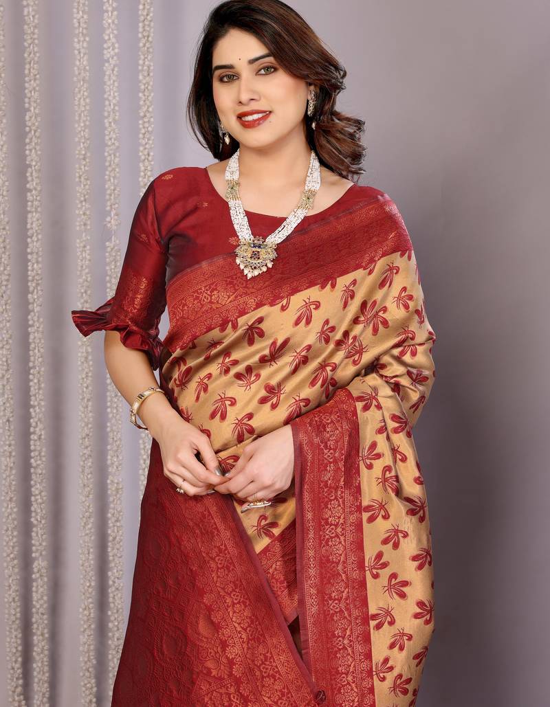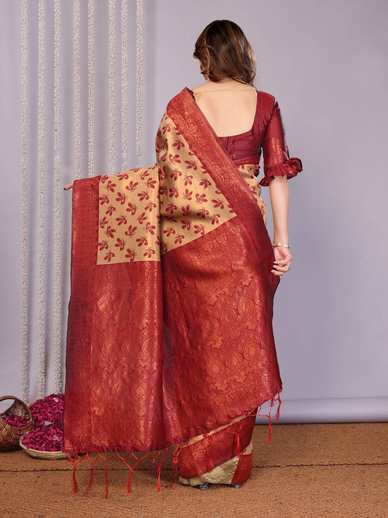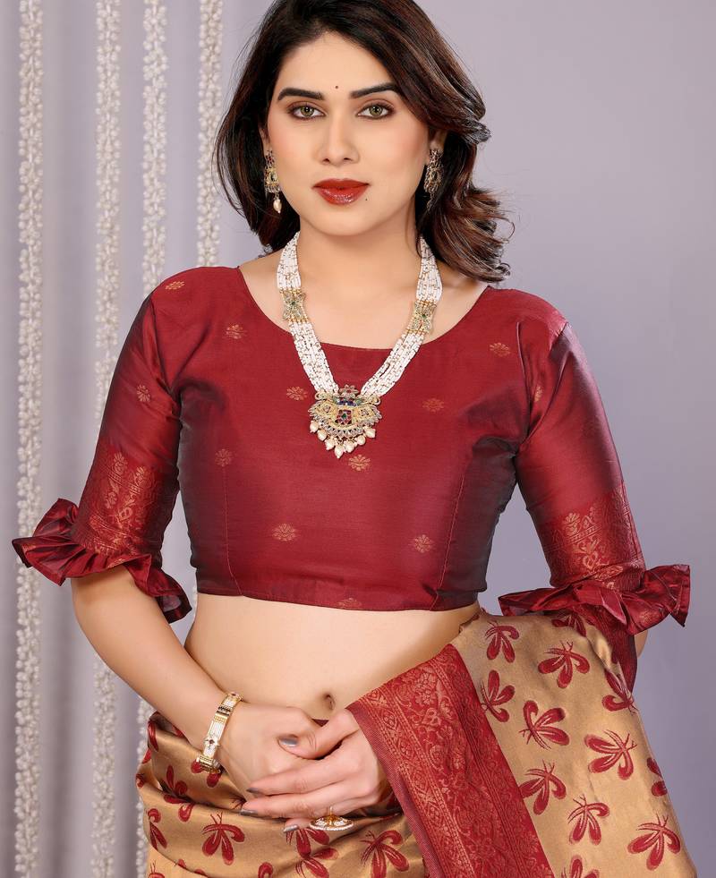 Cream maroon soft art silk blend banarasi jacuard work designer party wear saree with unstitched blouse piece