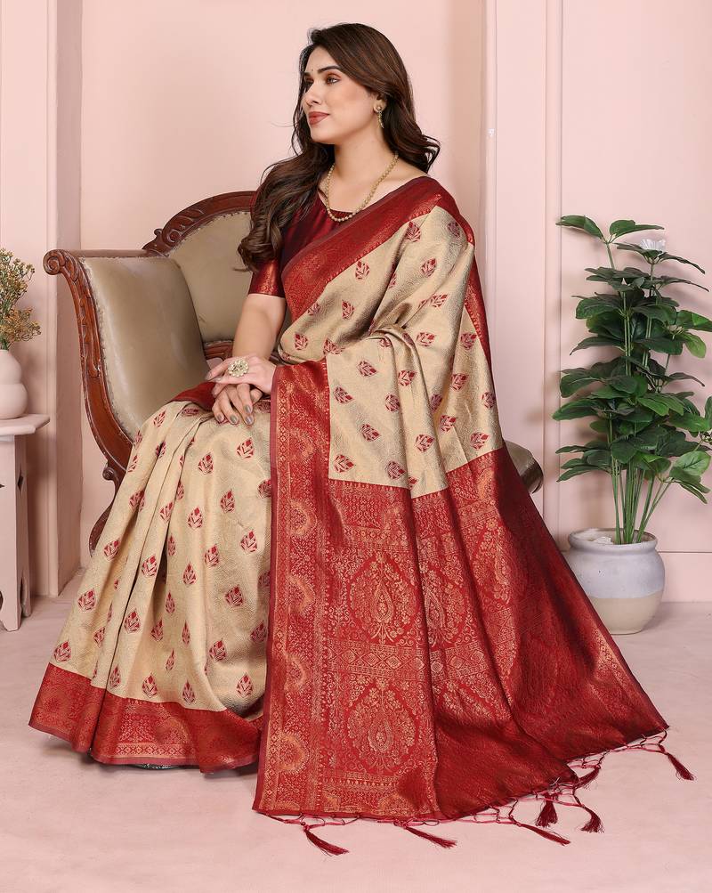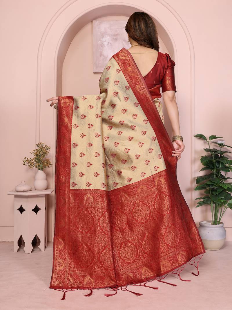 Cream maroon soft art silk blend banarasi jacuard work designer party wear saree with unstitched blouse piece
