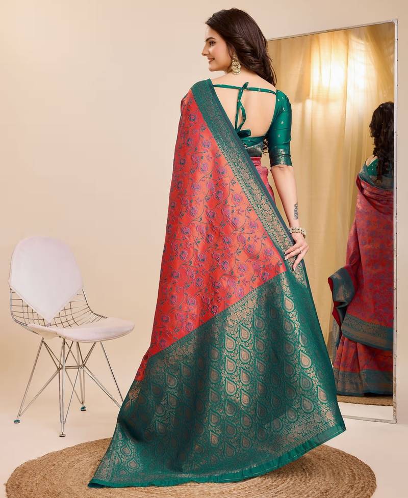 Gajri rama soft art silk blend banarasi jacuard work designer party wear saree with unstitched blouse piece