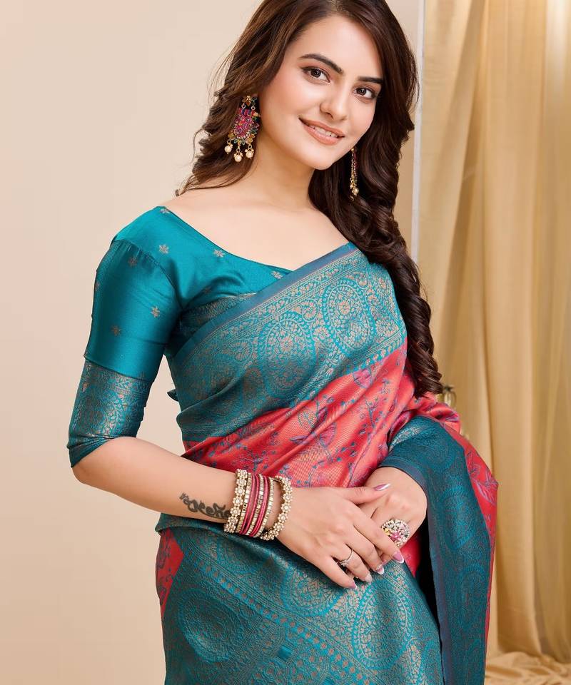 gajri rama  soft art silk blend banarasi jacuard work designer party wear saree with unstitched blouse piece