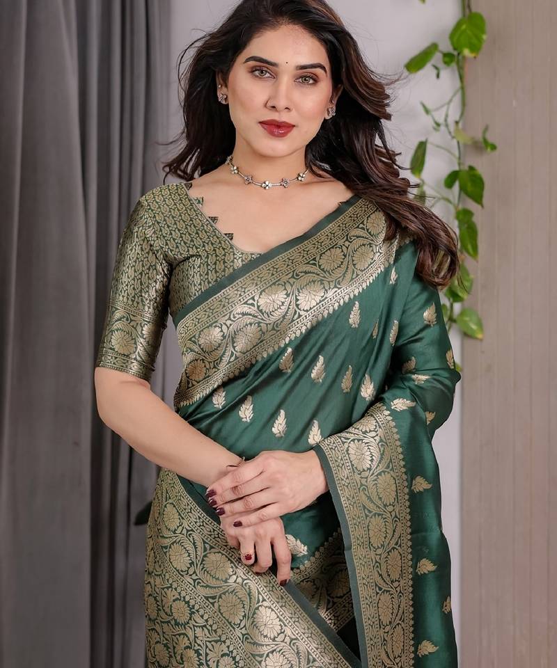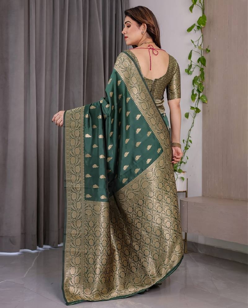 Green green soft art silk banarasi jacuard work designer party wear saree with unstitched blouse piece