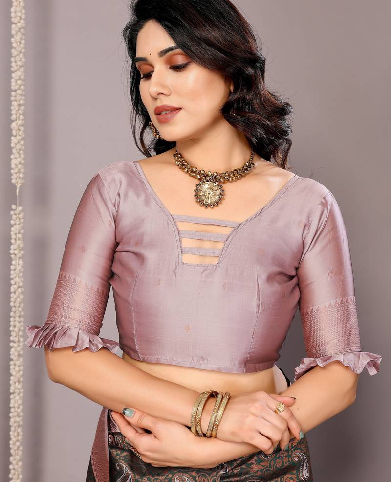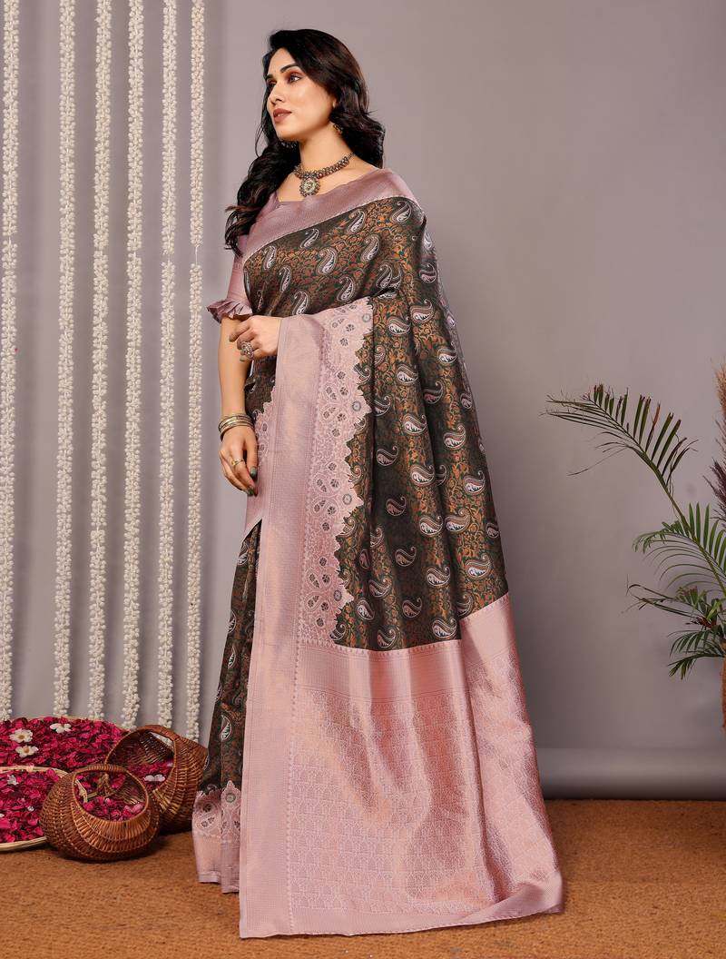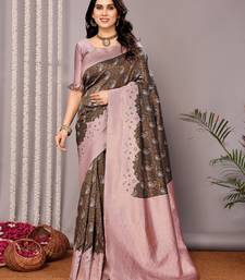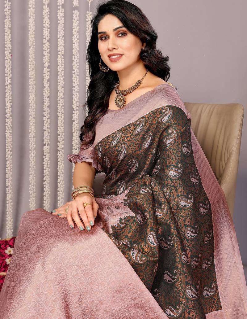 Green light pink silk blend banarasi jacuard work designer party wear saree with unstitched blouse piece