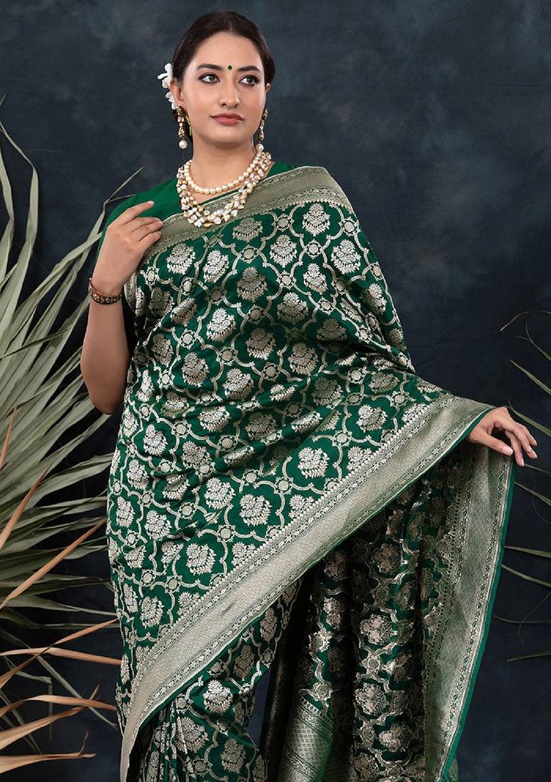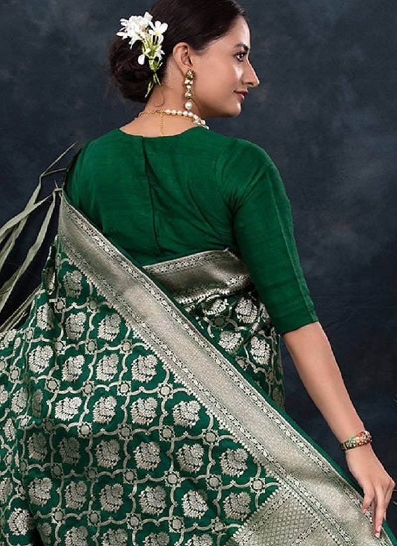 Green soft silk blend banarasi jacuard work designer party wear saree with unstitched blouse piece