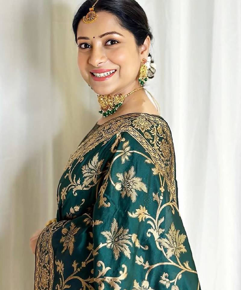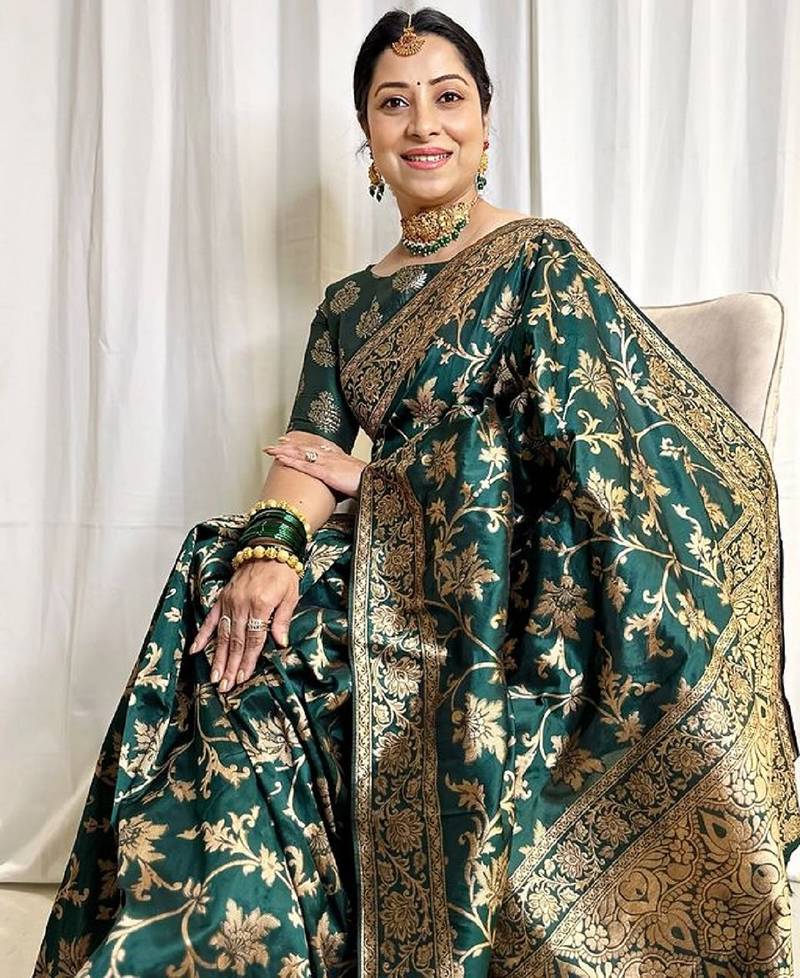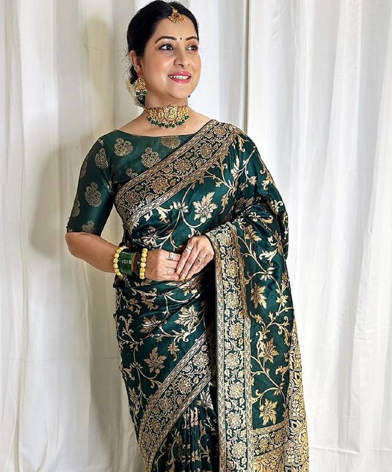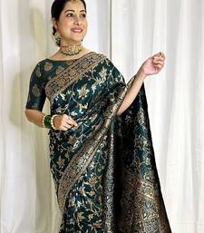 Green soft art silk banarasi jacuard work designer party wear saree with unstitched blouse piece