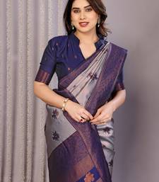 Grey neavy blue soft art silk blend banarasi jacuard work designer party wear saree with unstitched blouse piece