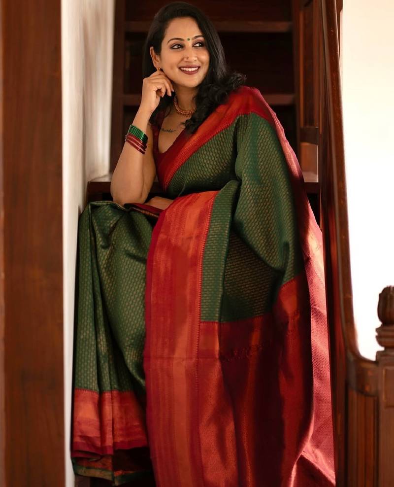 Grren red soft silk blend banarasi jacuard work designer party wear saree with unstitched blouse piece
