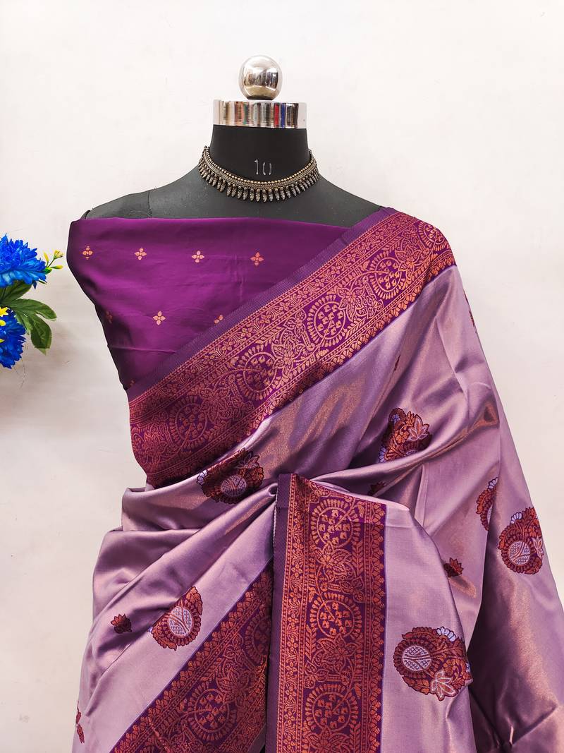 Lavender purple soft silk blend banarasi jacuard work designer party wear saree with unstitched blouse piece