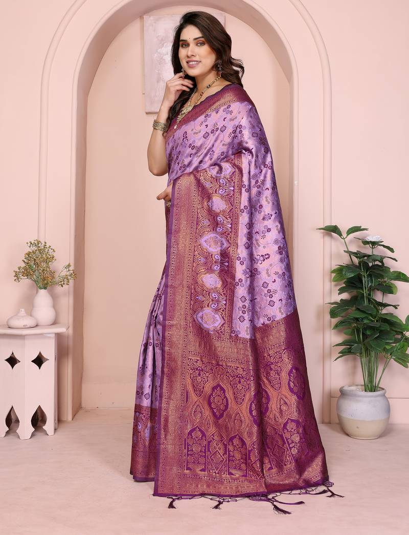 Lavender wine soft art silk blend banarasi jacuard work designer party wear saree with unstitched blouse piece
