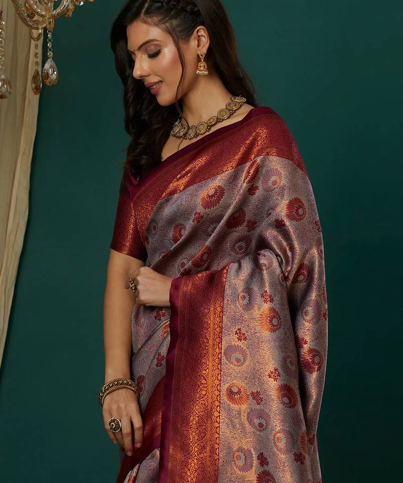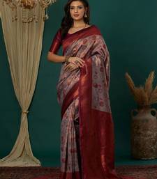 Lavender wine soft silk blend banarasi jacuard work designer party wear saree with unstitched blouse piece
