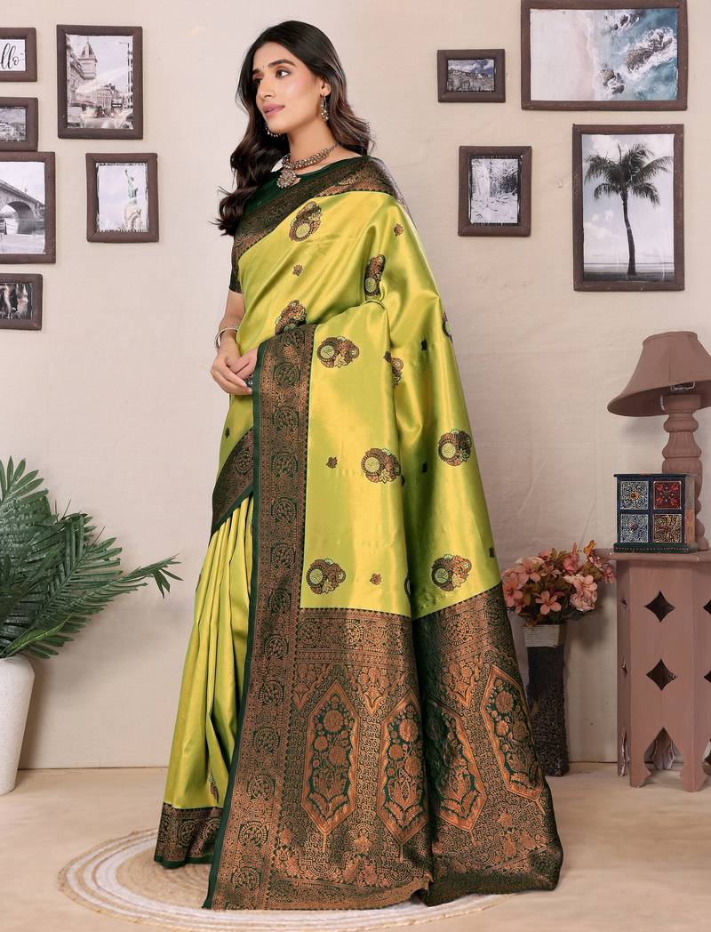 Lemon green soft silk blend banarasi jacuard work designer party wear saree with unstitched blouse piece
