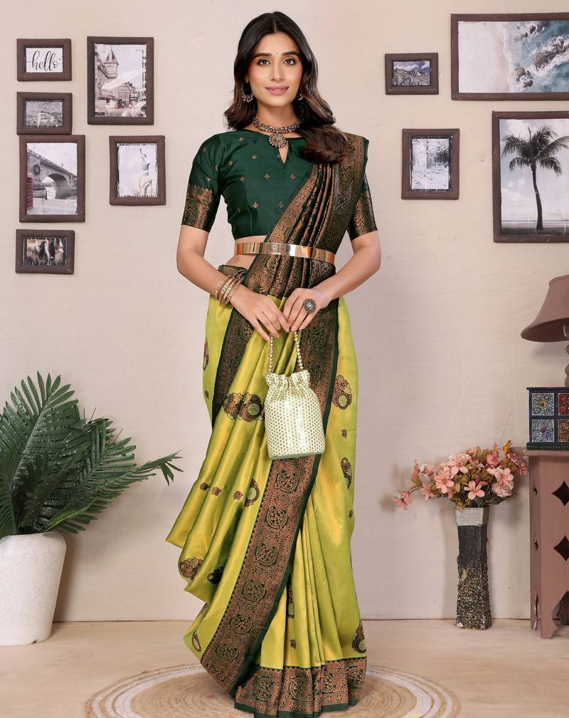 Lemon green  soft silk blend banarasi jacuard work designer party wear saree with unstitched blouse piece