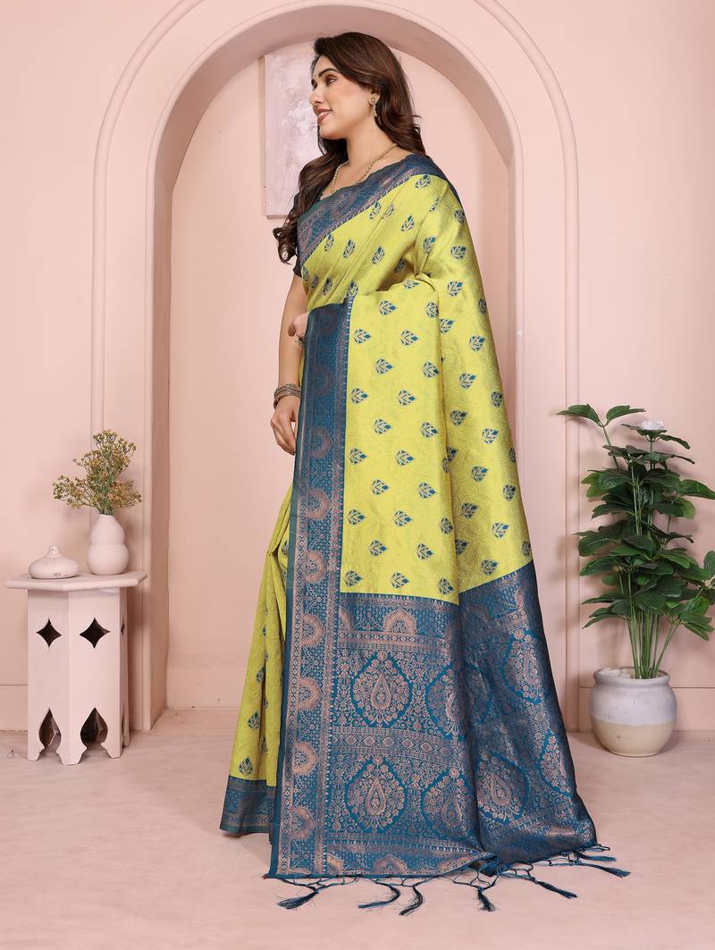 Lemon morpich soft art silk blend banarasi jacuard work designer party wear saree with unstitched blouse piece