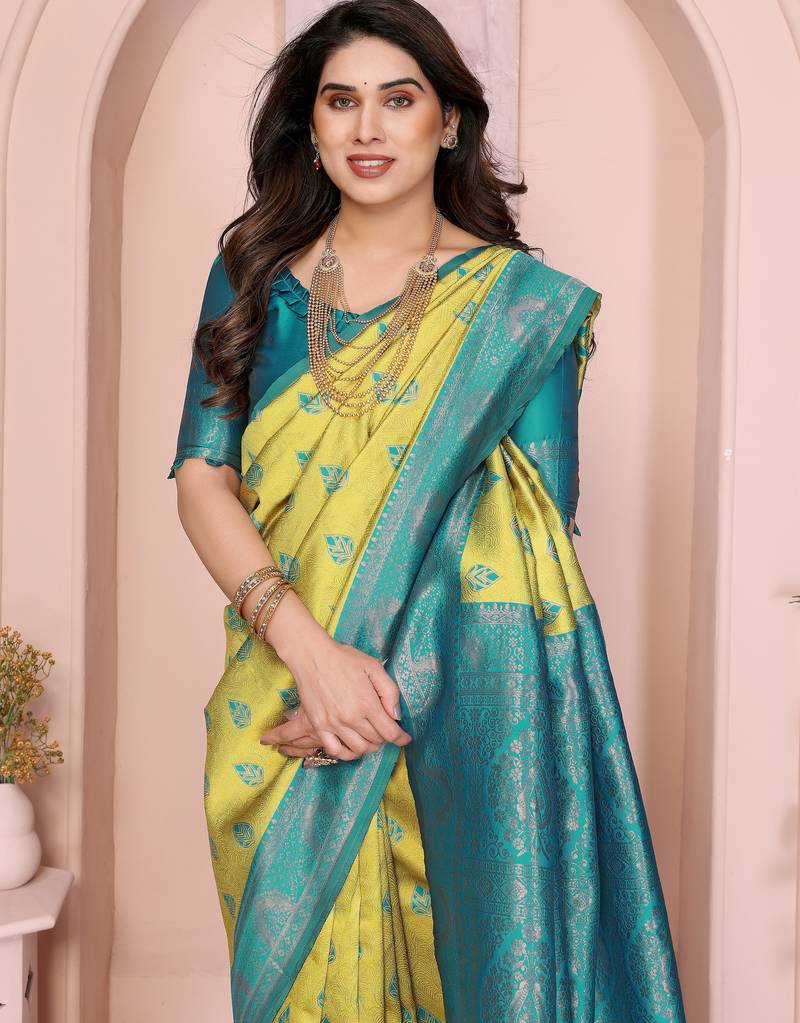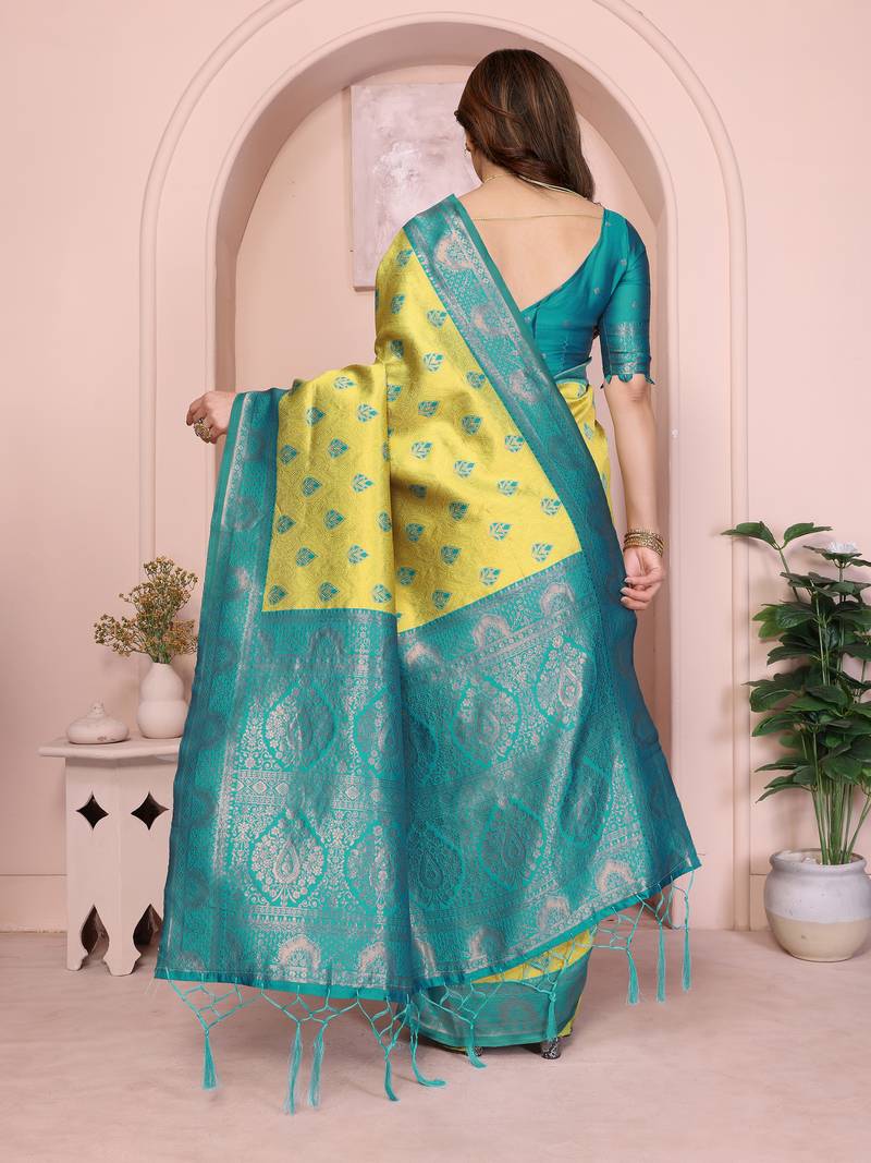Lemon rama soft art silk blend banarasi jacuard work designer party wear saree with unstitched blouse piece