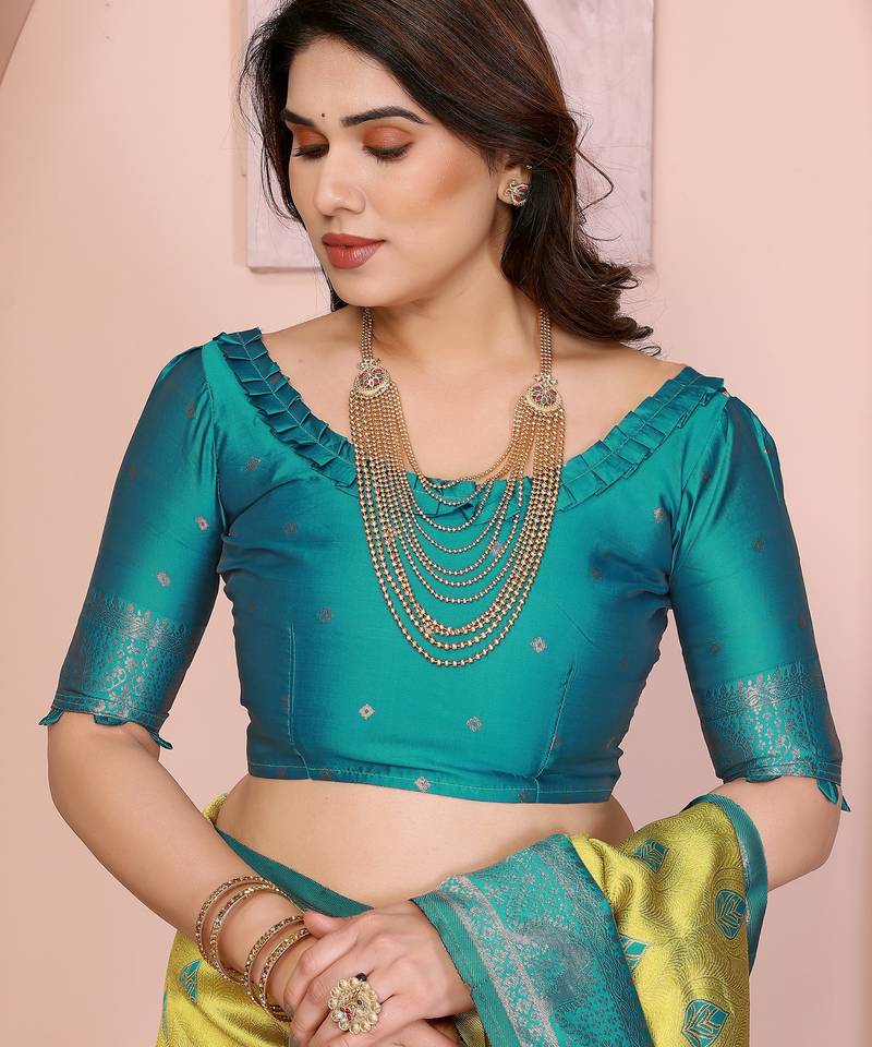 lemon rama  soft art silk blend banarasi jacuard work designer party wear saree with unstitched blouse piece