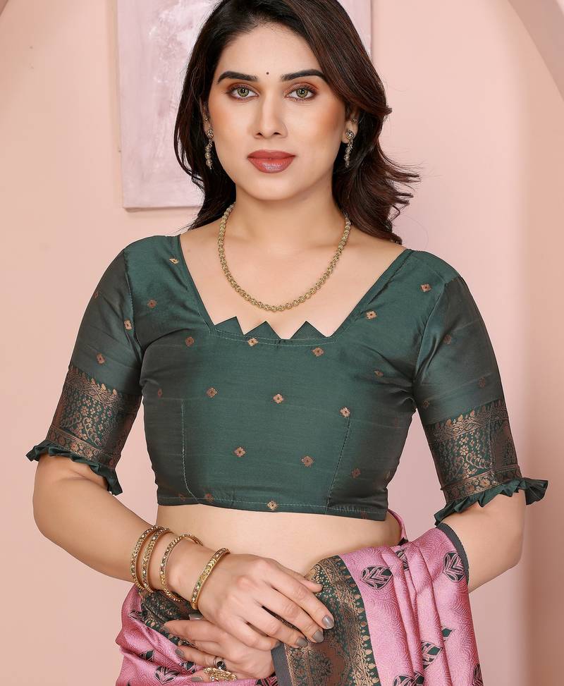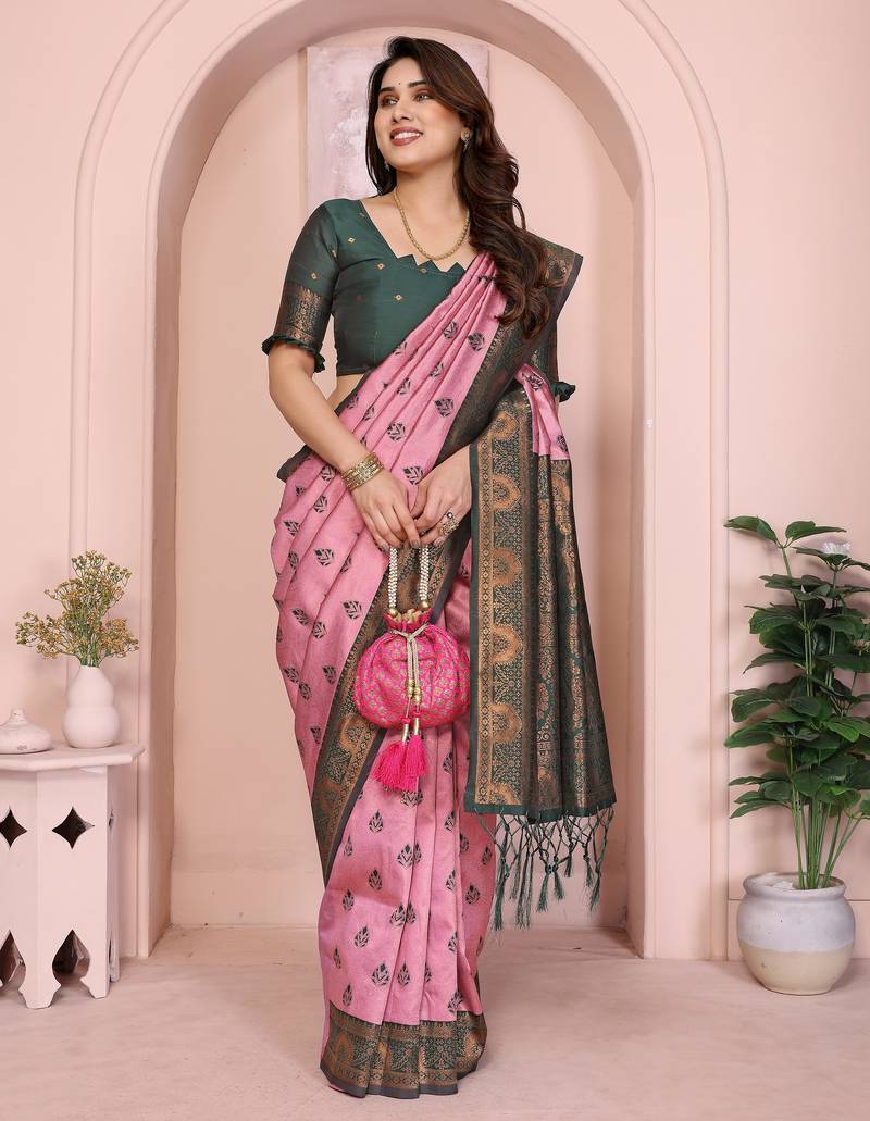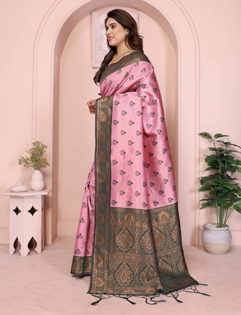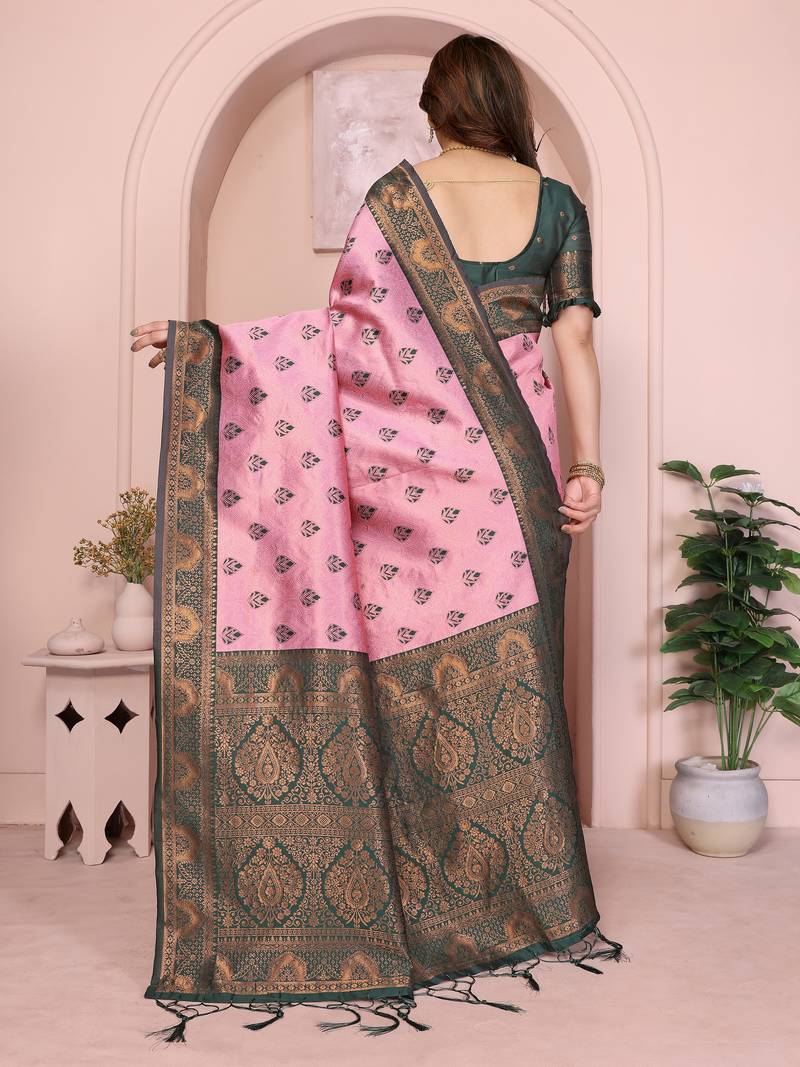 Light pink green soft art silk blend banarasi jacuard work designer party wear saree with unstitched blouse piece