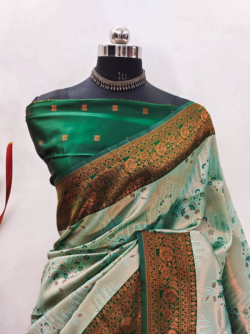 Light pista green soft art silk banarasi jacuard work designer party wear saree with unstitched blouse piece