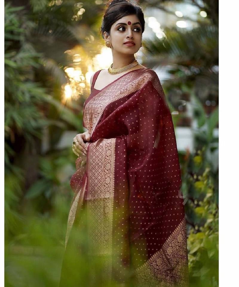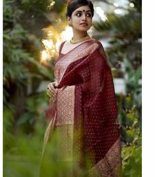 Maroon soft silk blend banarasi jacuard work designer party wear saree with unstitched blouse piece