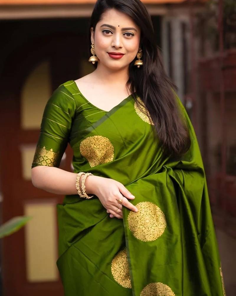 Mehendi soft silk blend banarasi jacuard work designer party wear saree with unstitched blouse piece