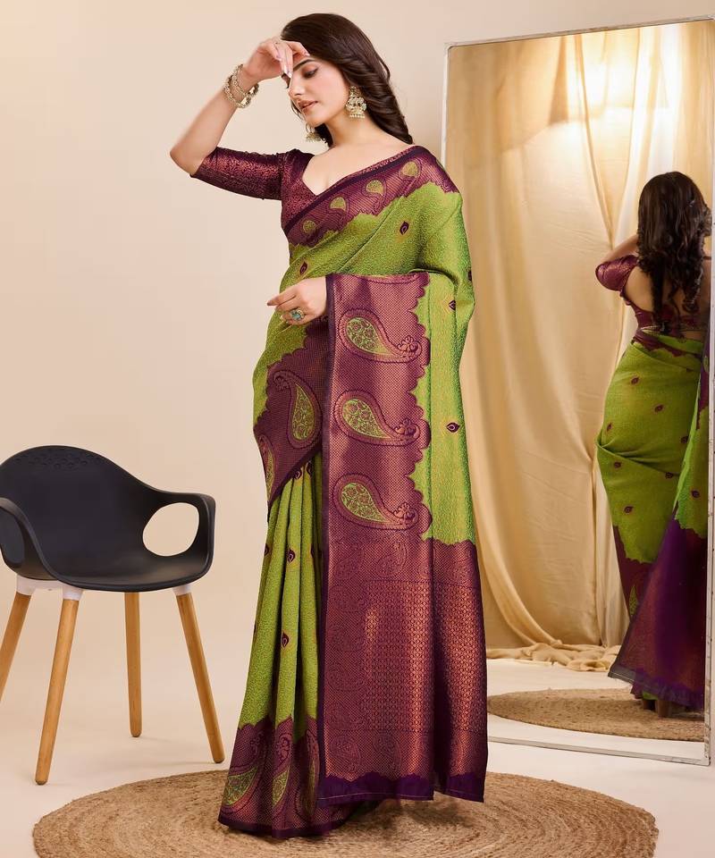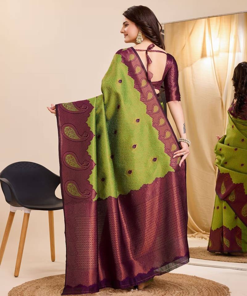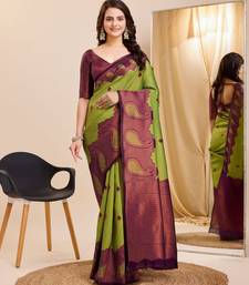Mehendi wine soft silk blend banarasi jacuard work designer party wear saree with unstitched blouse piece