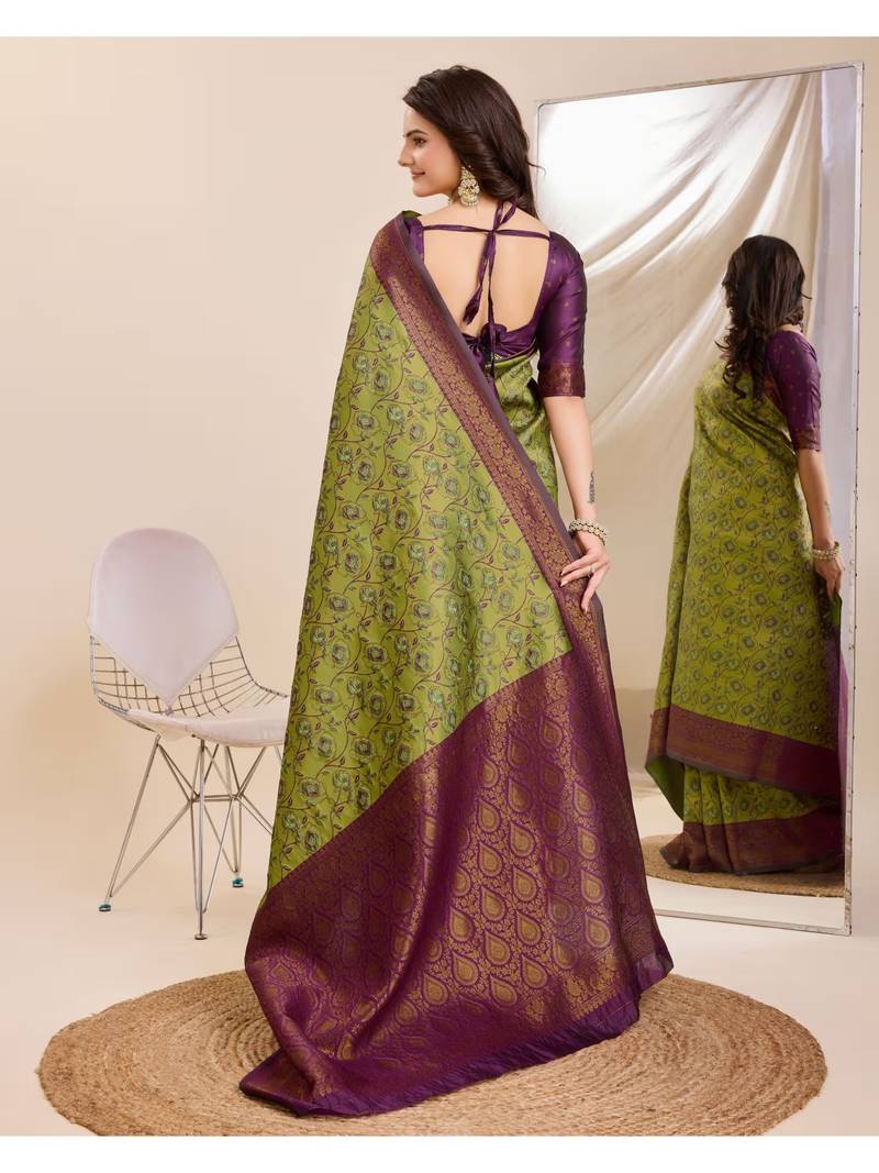 Mehendiwine soft art silk blend banarasi jacuard work designer party wear saree with unstitched blouse piece