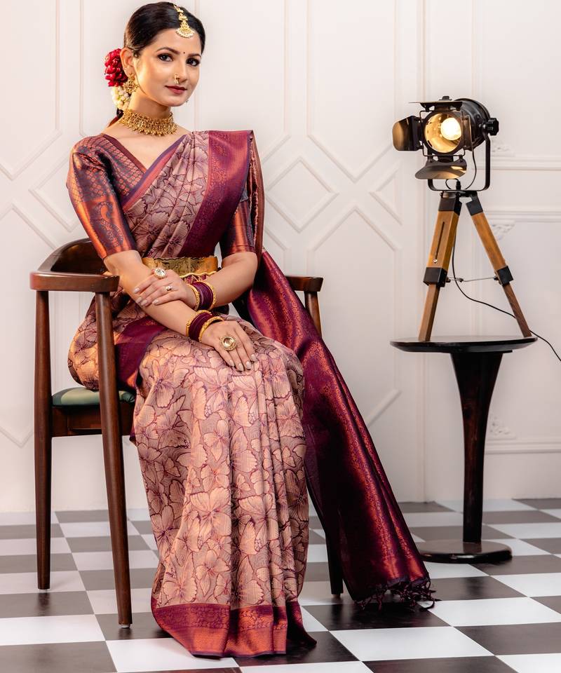 Mergenta soft art silk banarasi jacuard work designer party wear saree with unstitched blouse piece