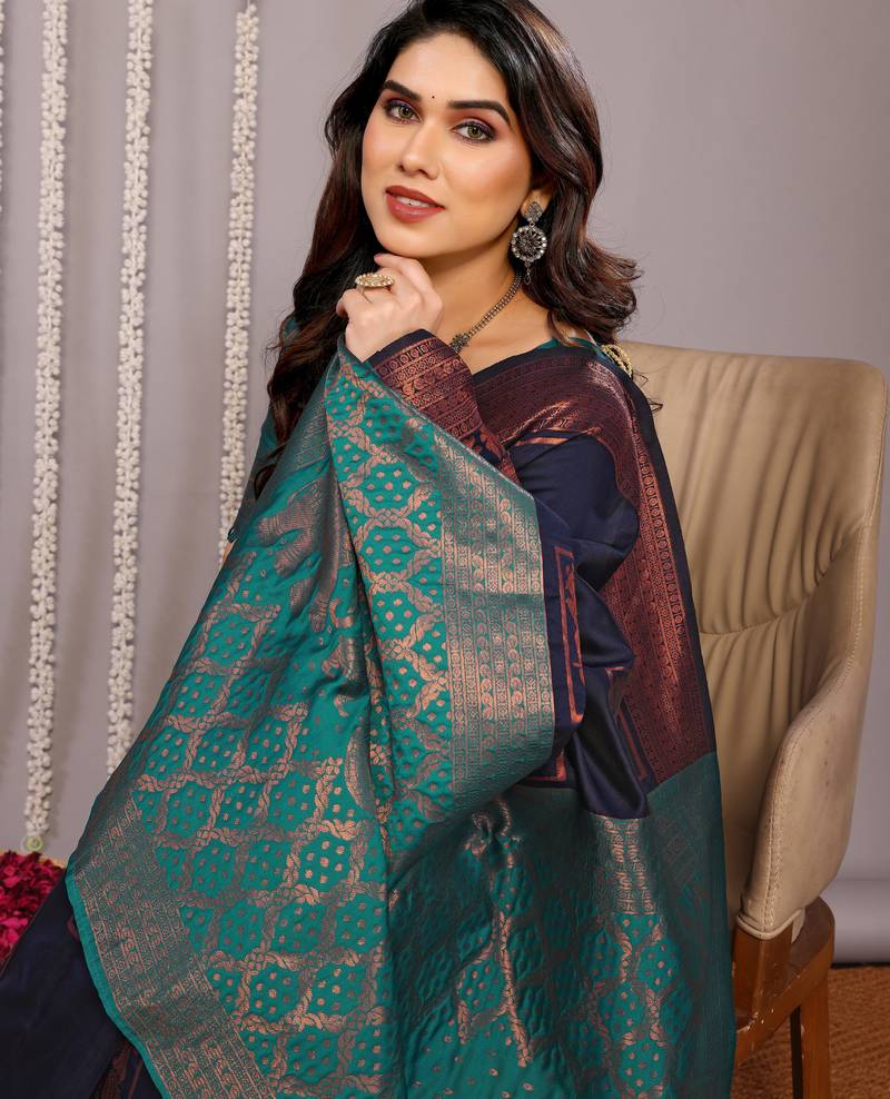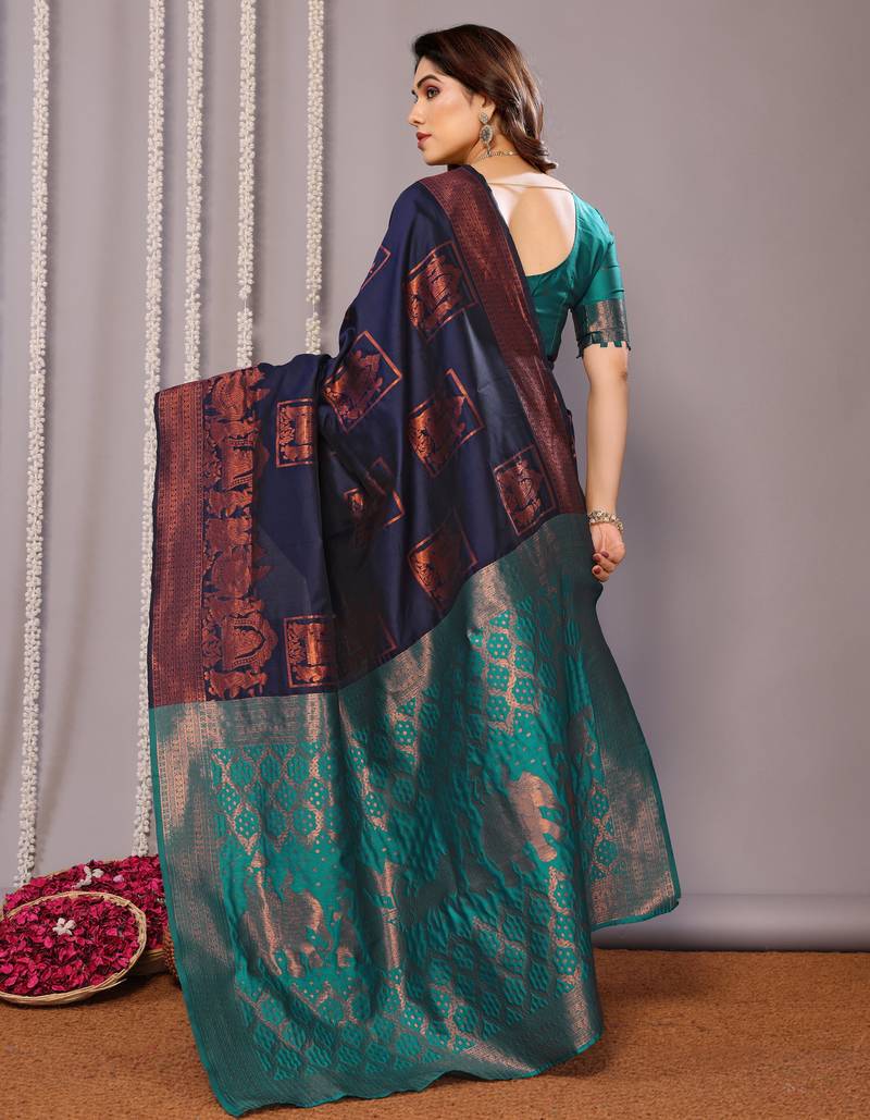 navy blue soft art silk banarasi saree with blouse