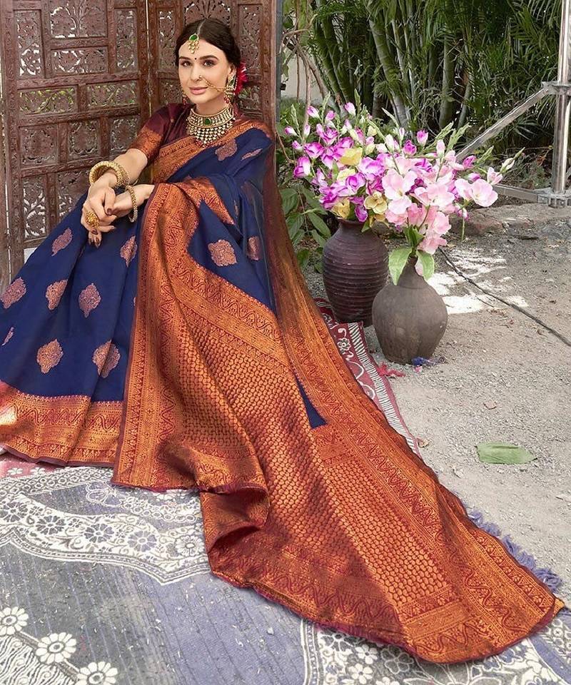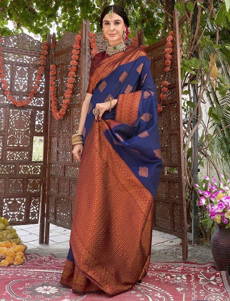 Neavy blue wine soft art silk blend banarasi jacuard work designer party wear saree with unstitched blouse piece