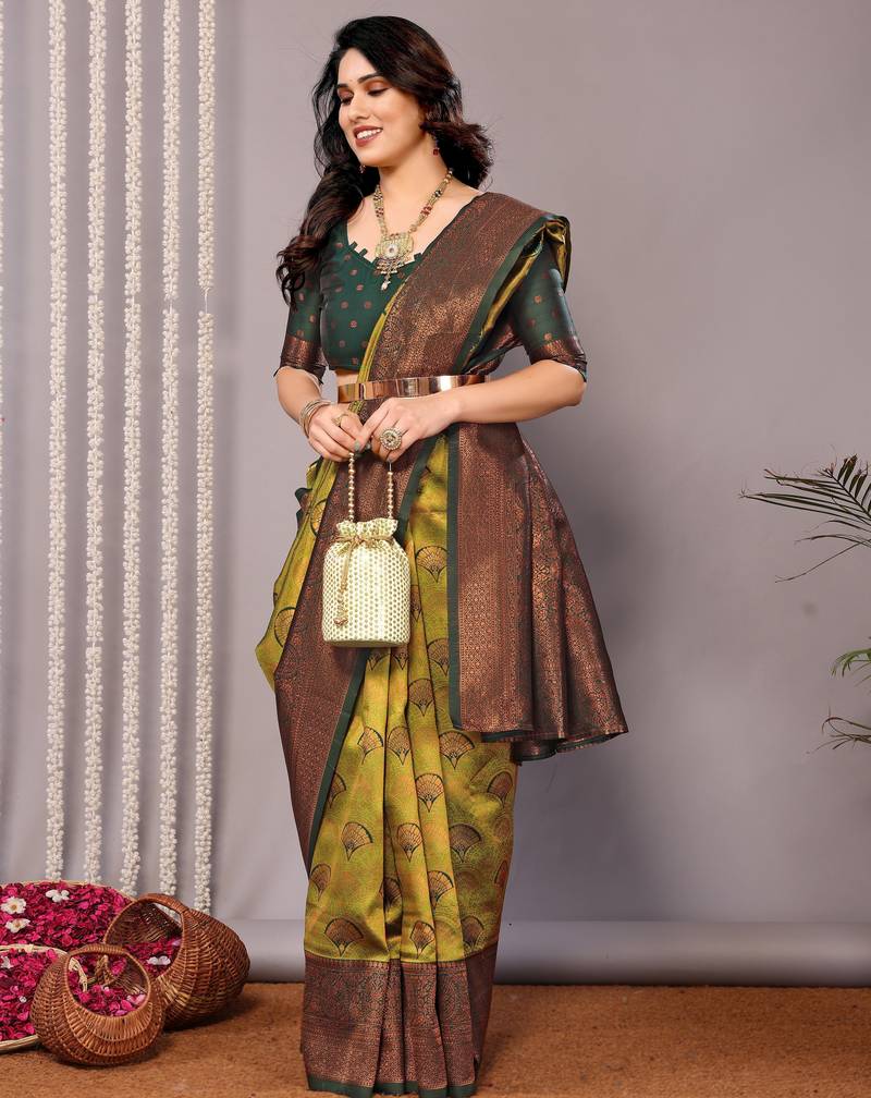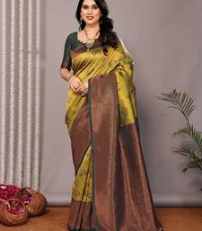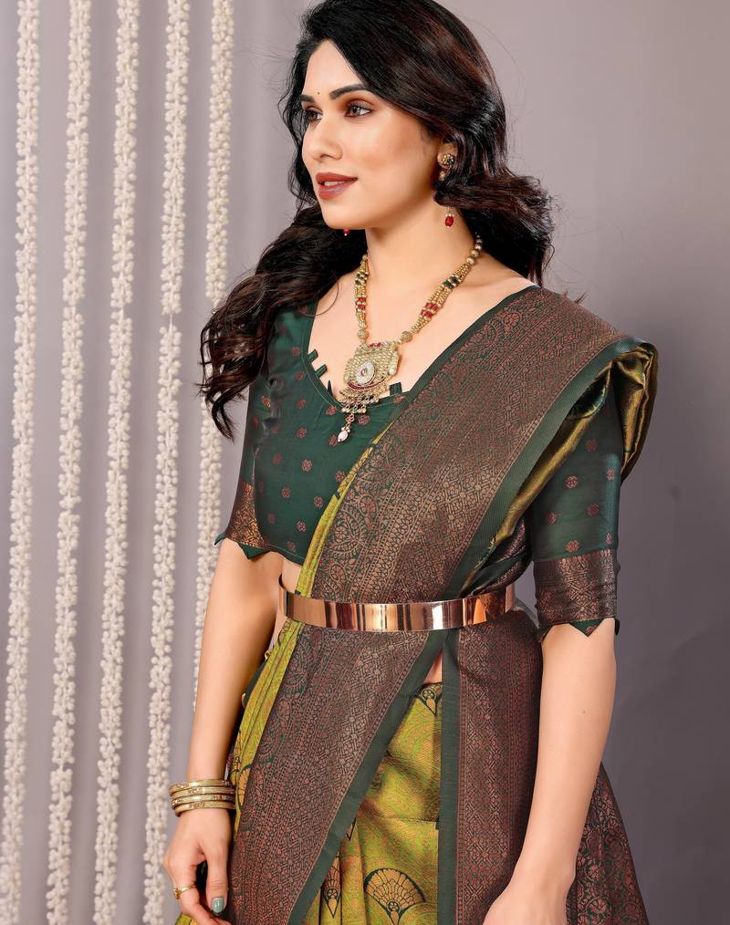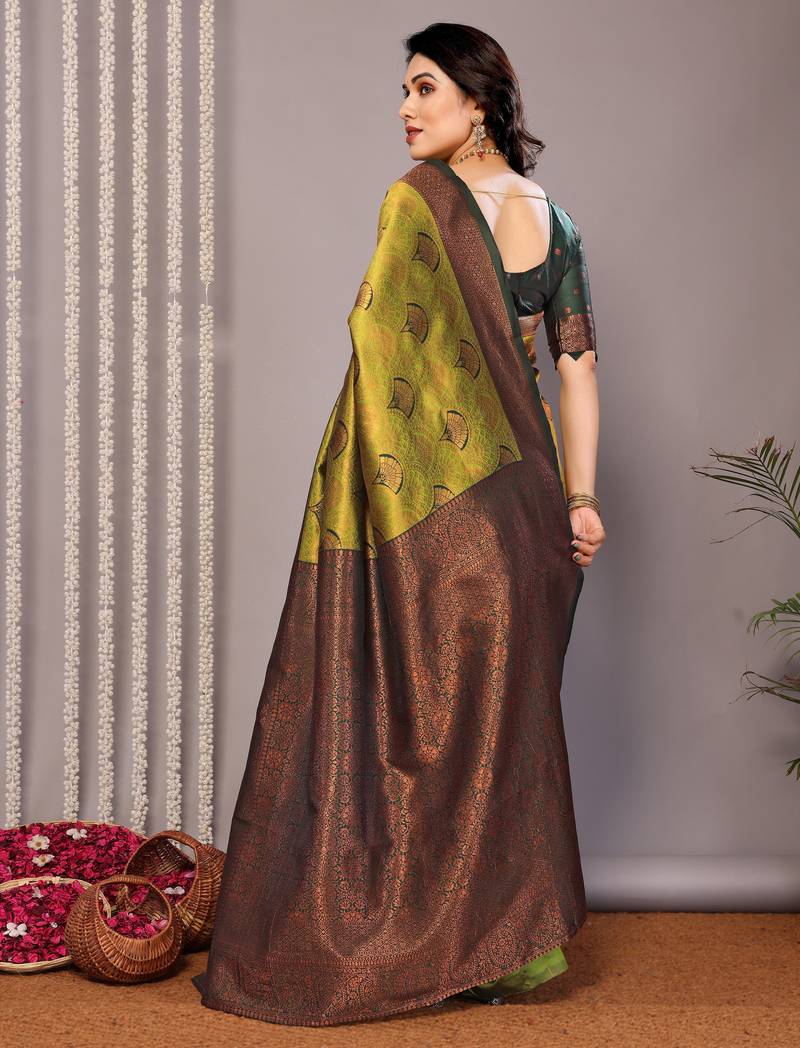 Parrot green soft silk blend banarasi jacuard work designer party wear saree with unstitched blouse piece