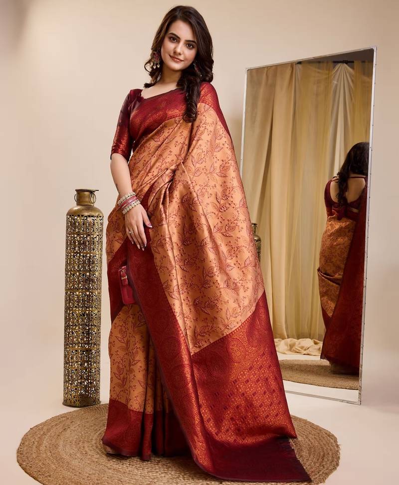 Peach maroon soft art silk blend banarasi jacuard work designer party wear saree with unstitched blouse piece