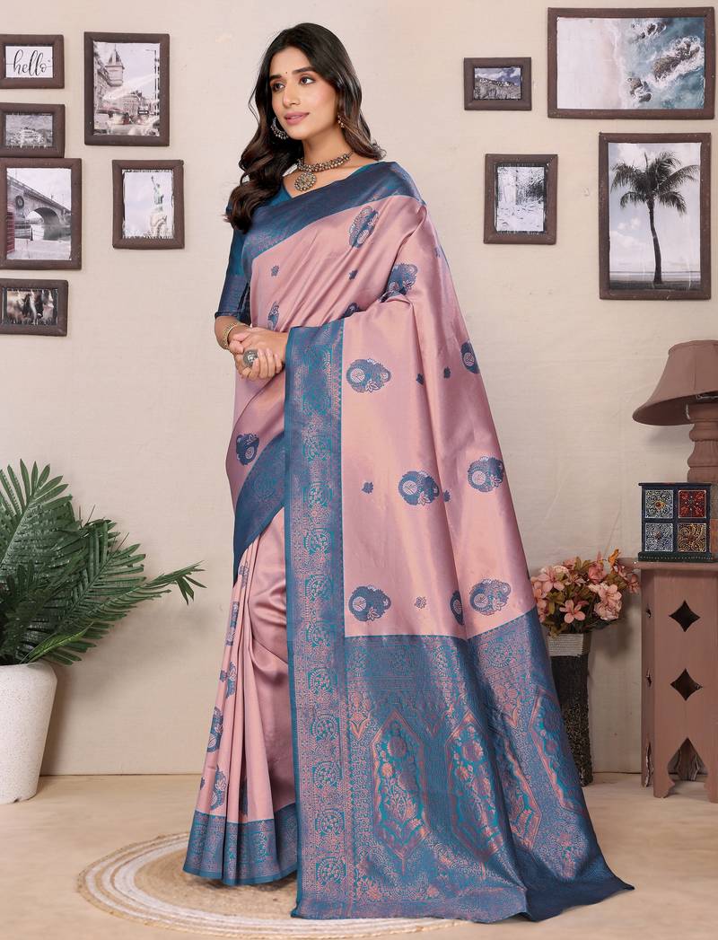 Peach sky blue soft silk blend banarasi jacuard work designer party wear saree with unstitched blouse piece