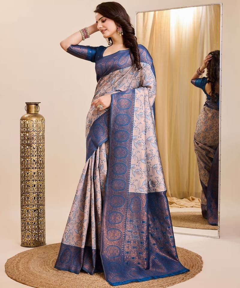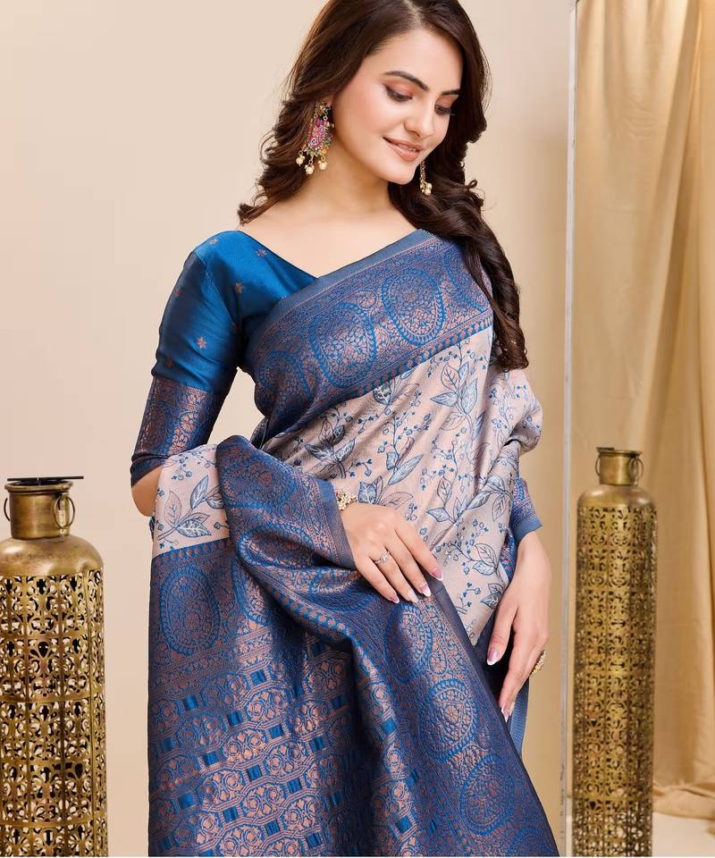 Peach sky soft art silk blend banarasi jacuard work designer party wear saree with unstitched blouse piece