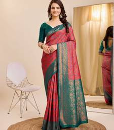 Peach sky soft art silk blend banarasi jacuard work designer party wear saree with unstitched blouse piece