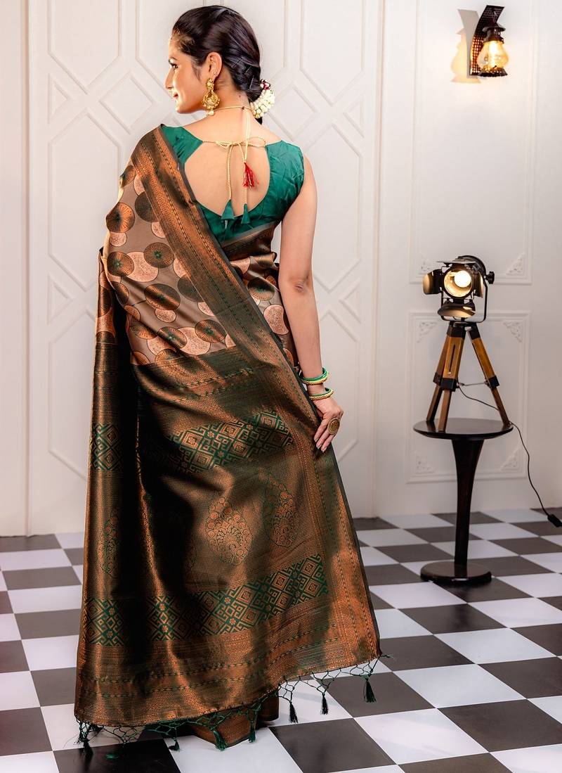 Peach soft art silk banarasi jacuard work designer party wear saree with unstitched blouse piece