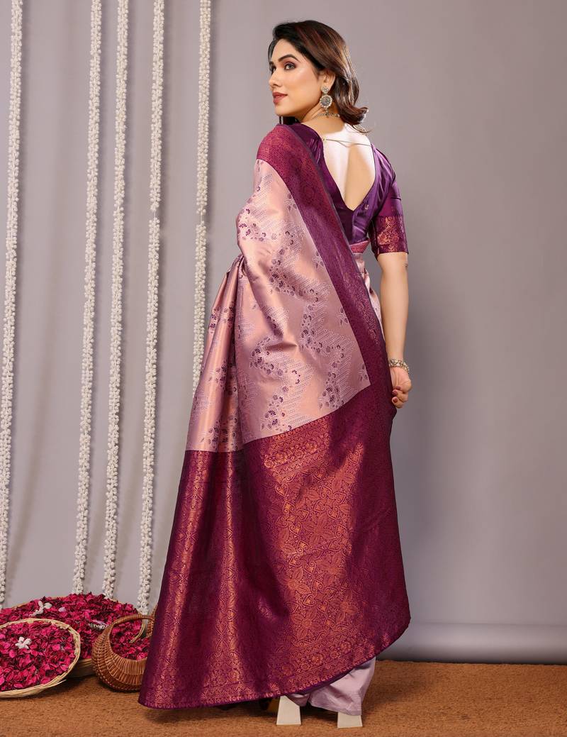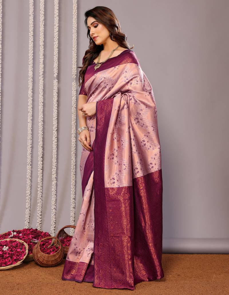 Peach wine soft art silk banarasi jacuard work designer party wear saree with unstitched blouse piece