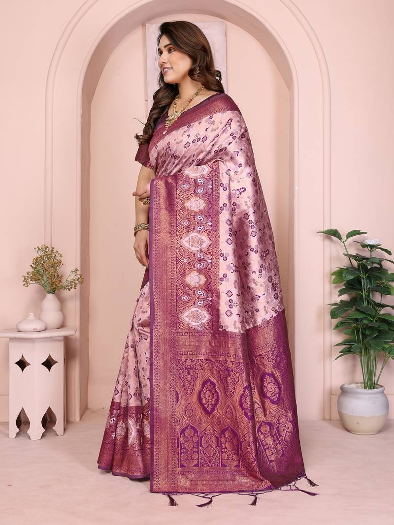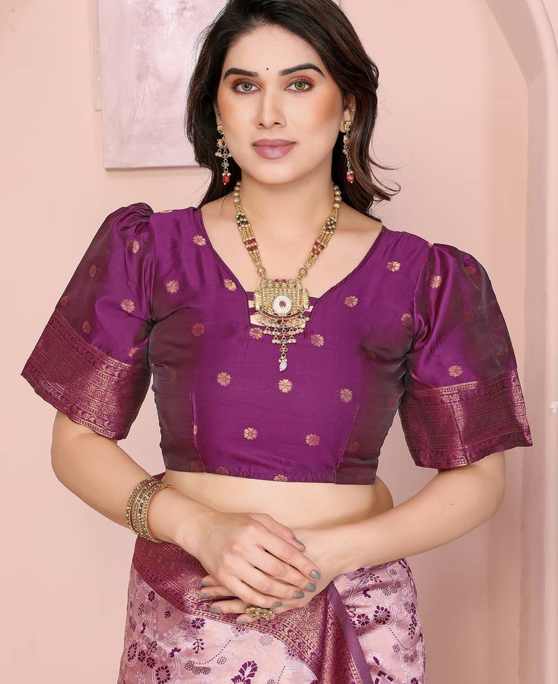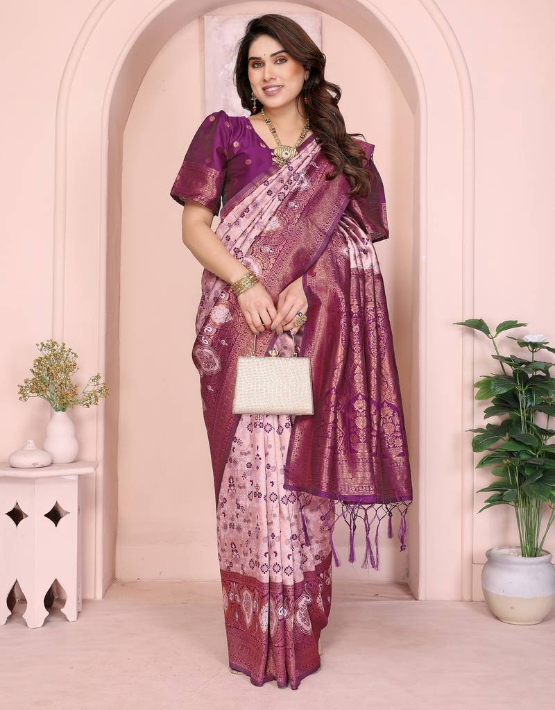 Product Name Peach Wine Soft Art Silk Blend Banarasi Jacuard Work Designer Party Wear Saree With Unstitched Blouse Piece