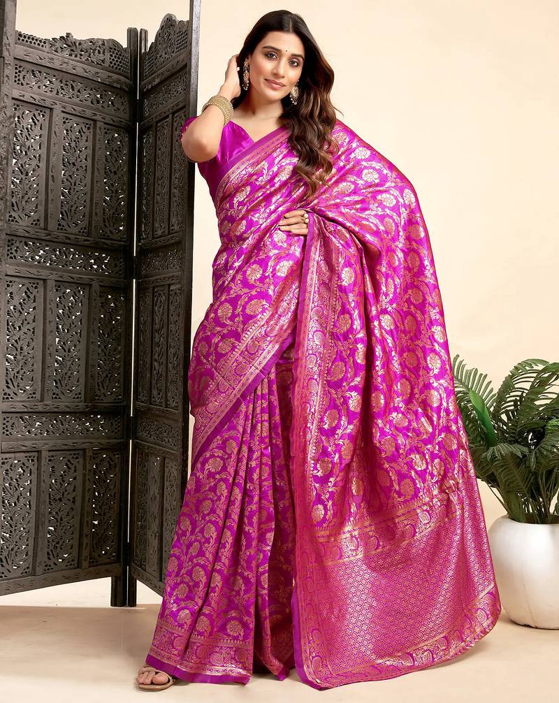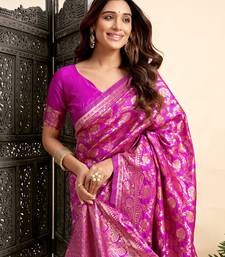 Pink soft silk blend banarasi jacuard work designer party wear saree with unstitched blouse piece