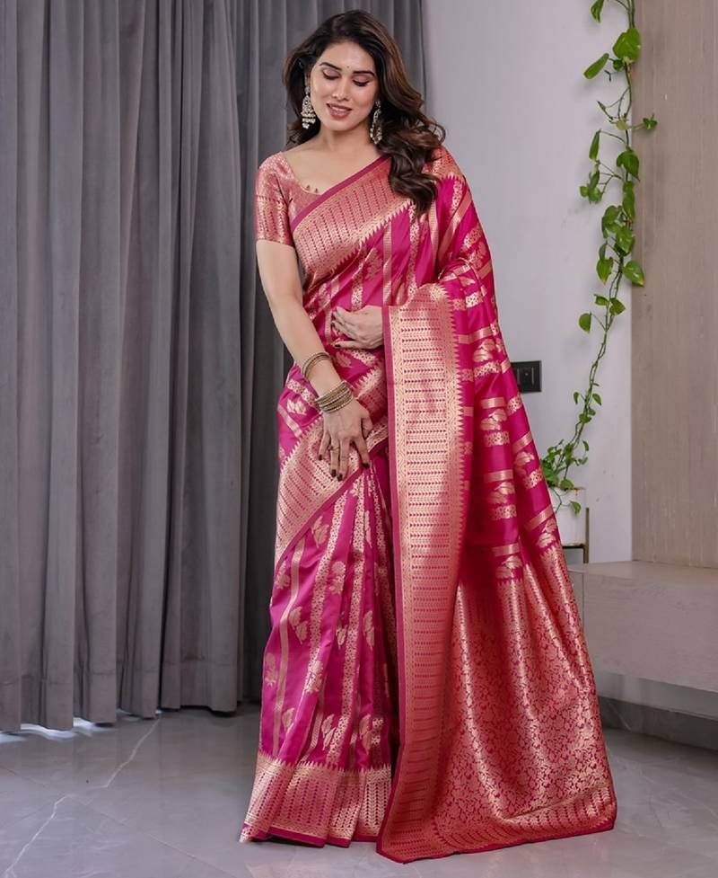 Pink soft art silk banarasi jacuard work designer party wear saree with unstitched blouse piece