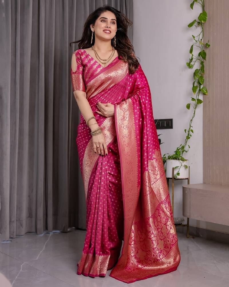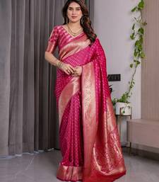 Pink soft art silk banarasi jacuard work designer party wear saree with unstitched blouse piece