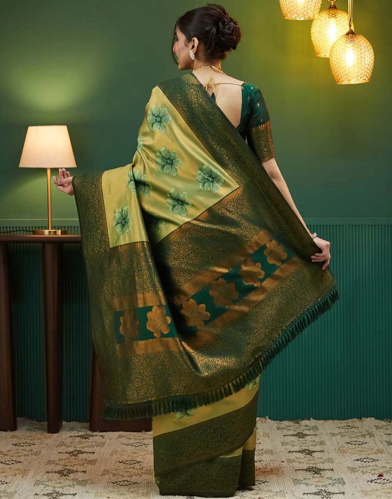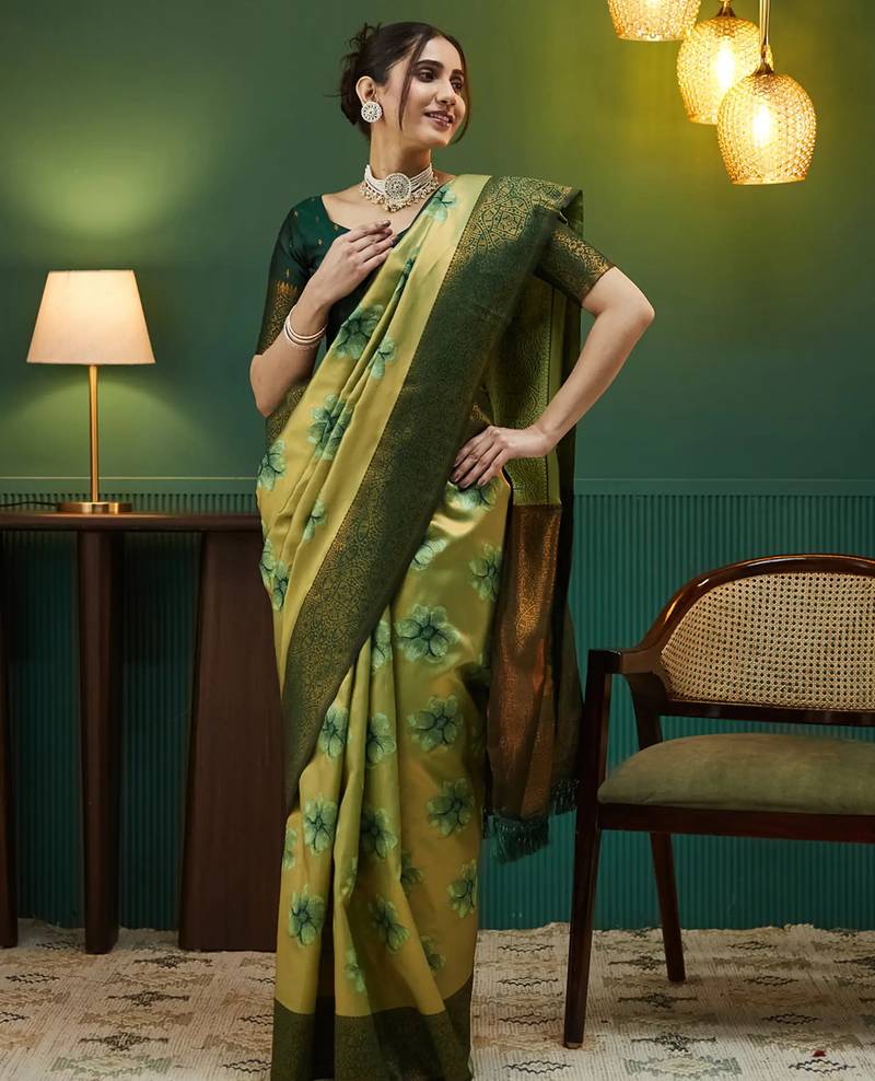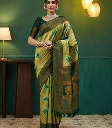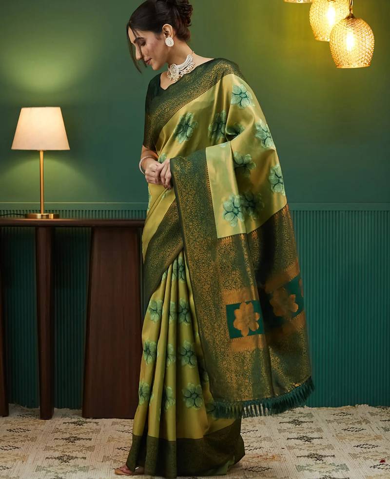 Pista green soft art silk blend banarasi jacuard work designer party wear saree with unstitched blouse piece