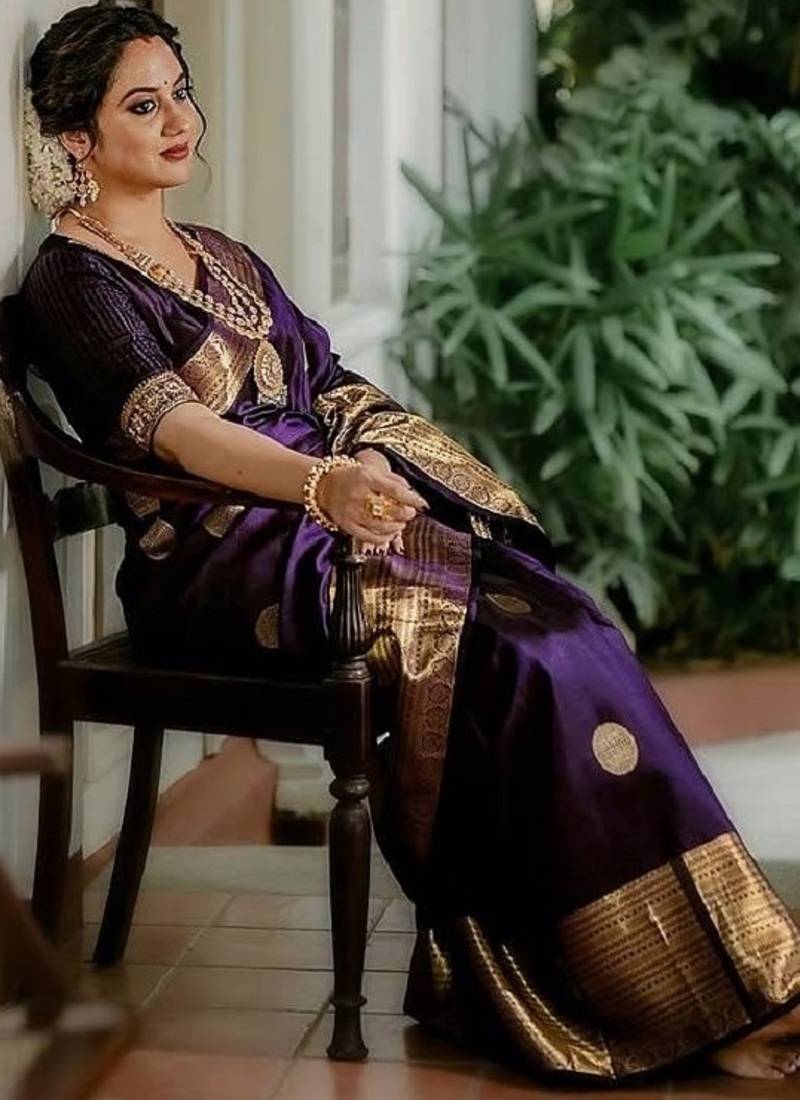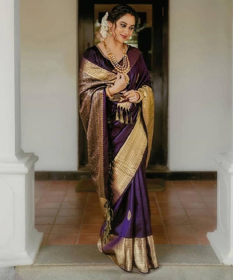 Purple soft silk blend banarasi jacuard work designer party wear saree with unstitched blouse piece
