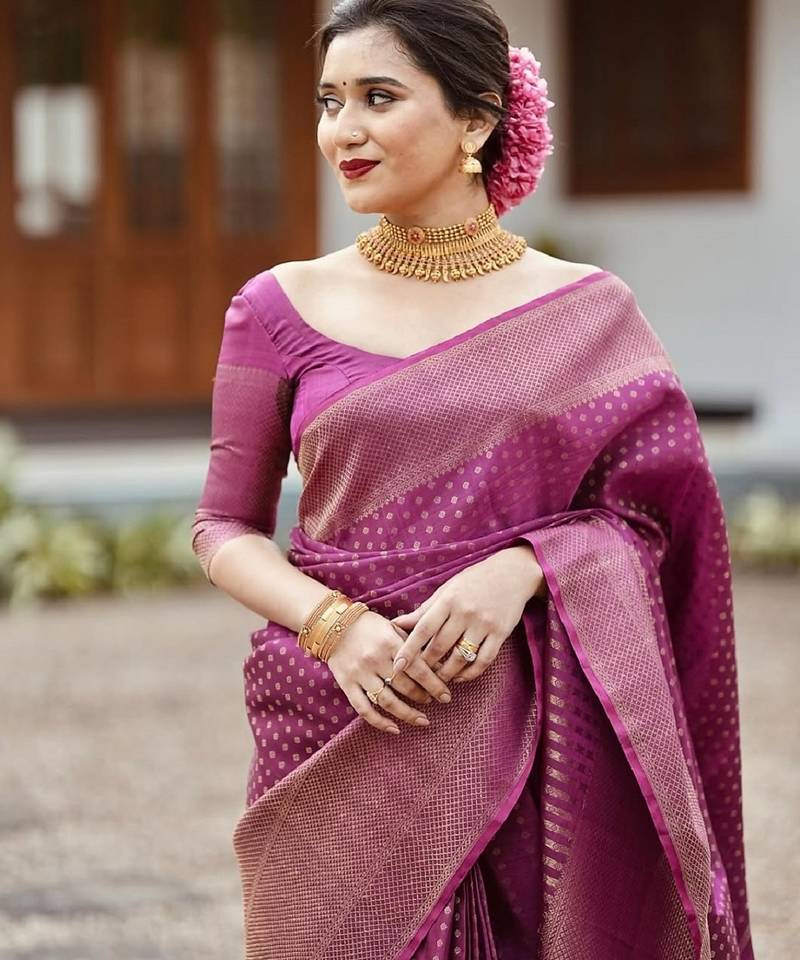Purple soft silk blend banarasi jacuard work designer party wear saree with unstitched blouse piece