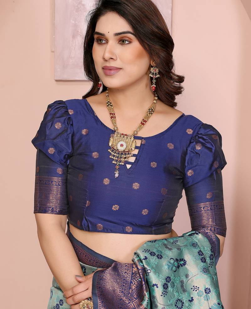 Rama blue soft art silk blend banarasi jacuard work designer party wear saree with unstitched blouse piece