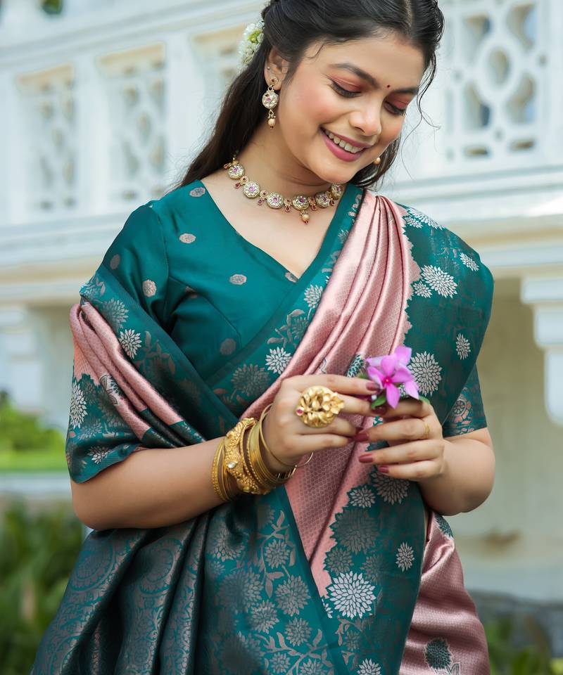 Rama peach soft silk blend banarasi jacuard work designer party wear saree with unstitched blouse piece