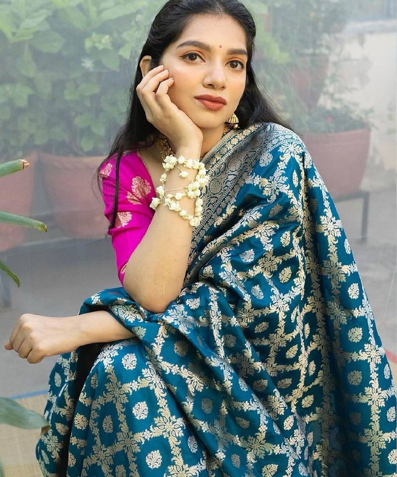 Rama pink soft silk blend banarasi jacuard work designer party wear saree with unstitched blouse piece