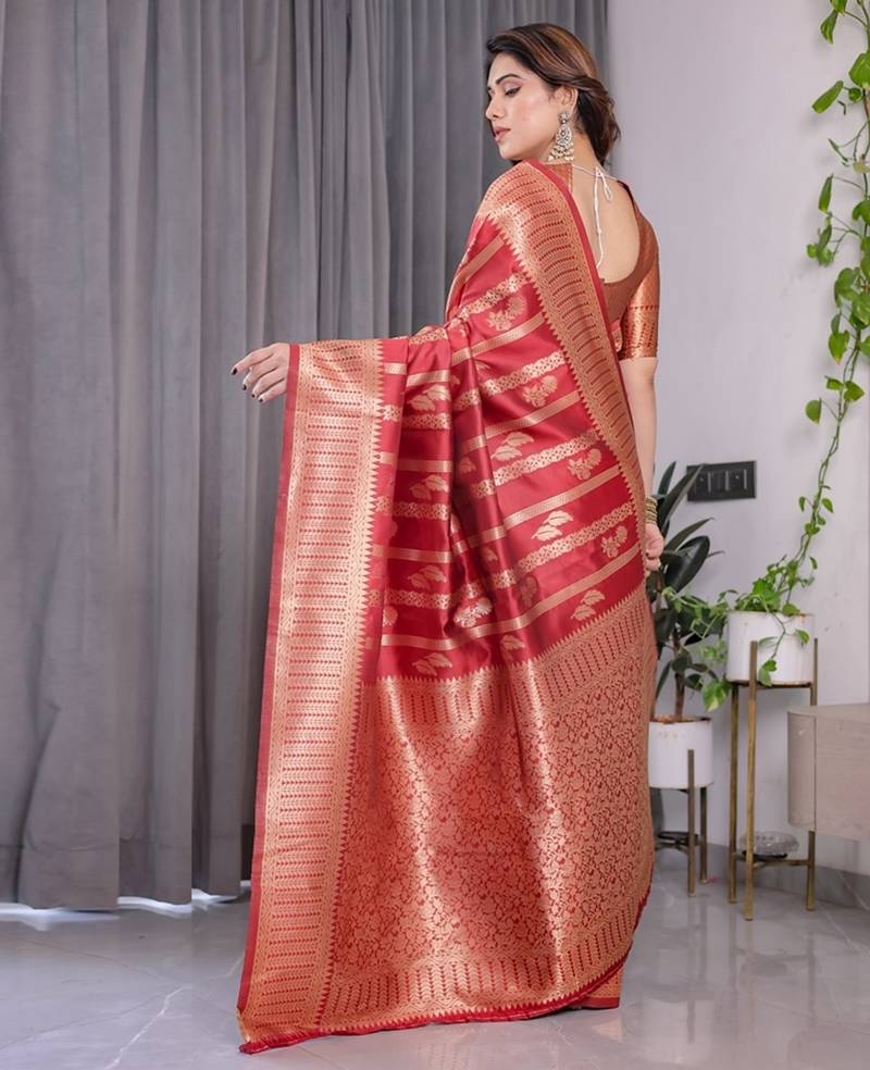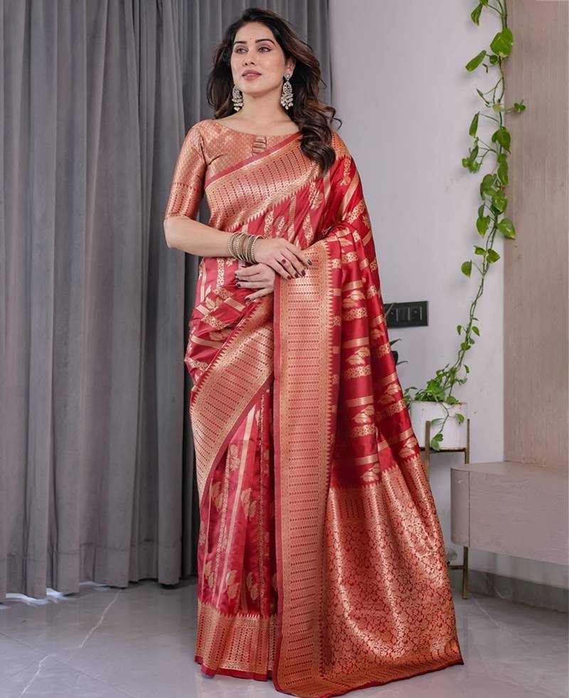 Red soft art silk banarasi jacuard work designer party wear saree with unstitched blouse piece