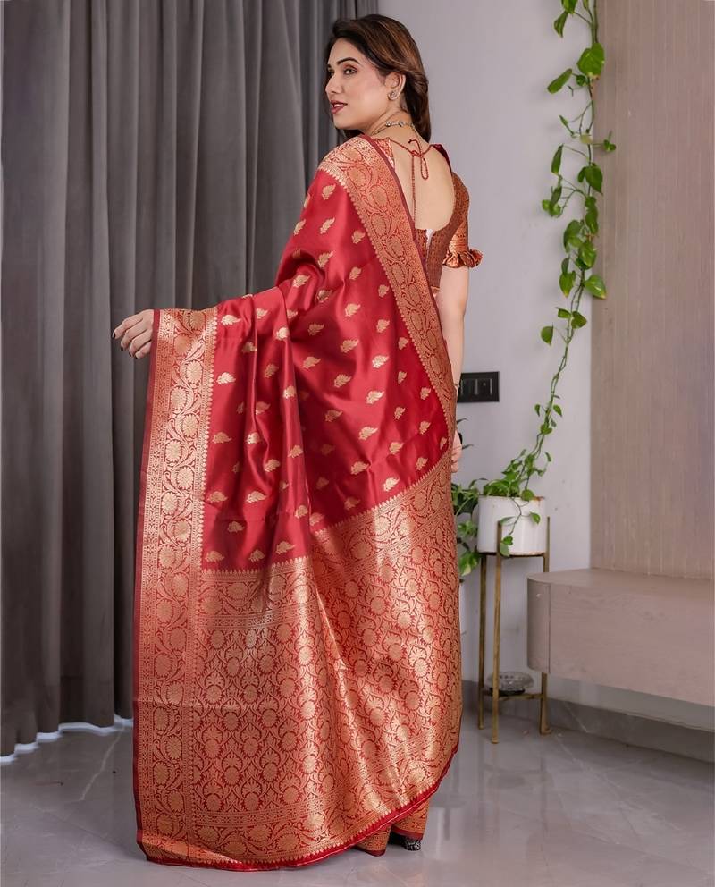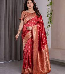 Red soft art silk banarasi jacuard work designer party wear saree with unstitched blouse piece
