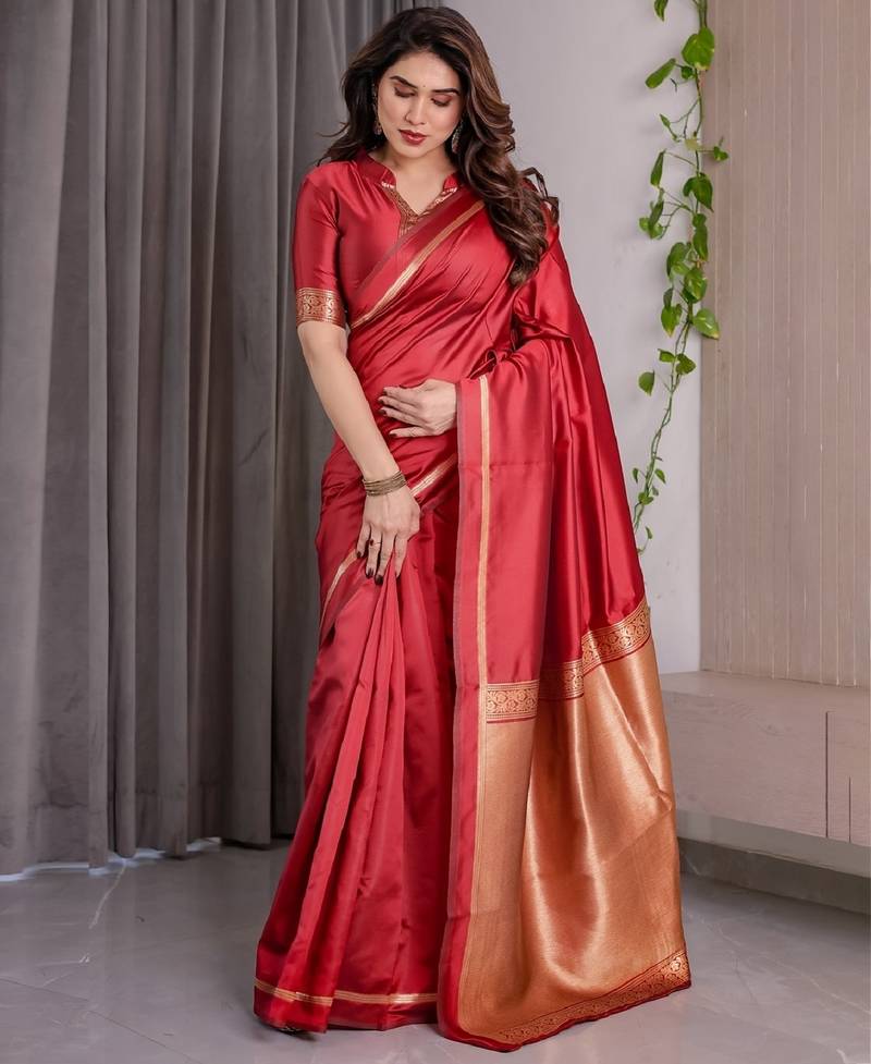Red soft art silk banarasi jacuard work designer party wear saree with unstitched blouse piece