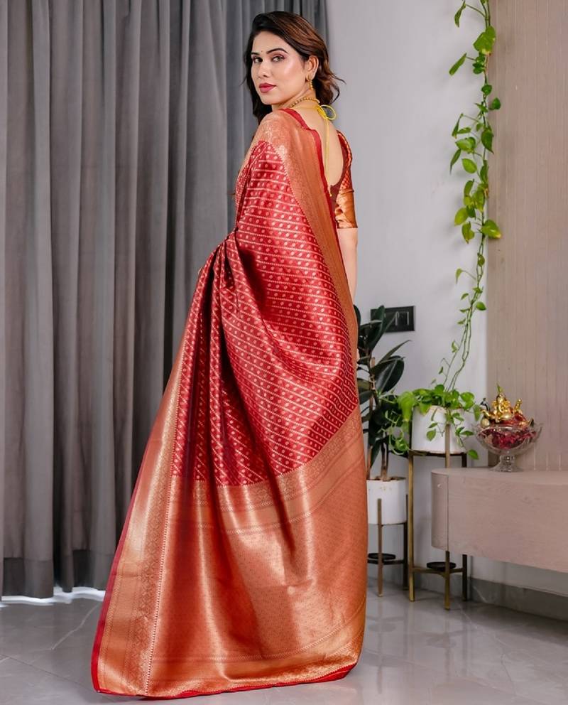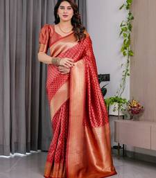 Red soft art silk banarasi jacuard work designer party wear saree with unstitched blouse piece