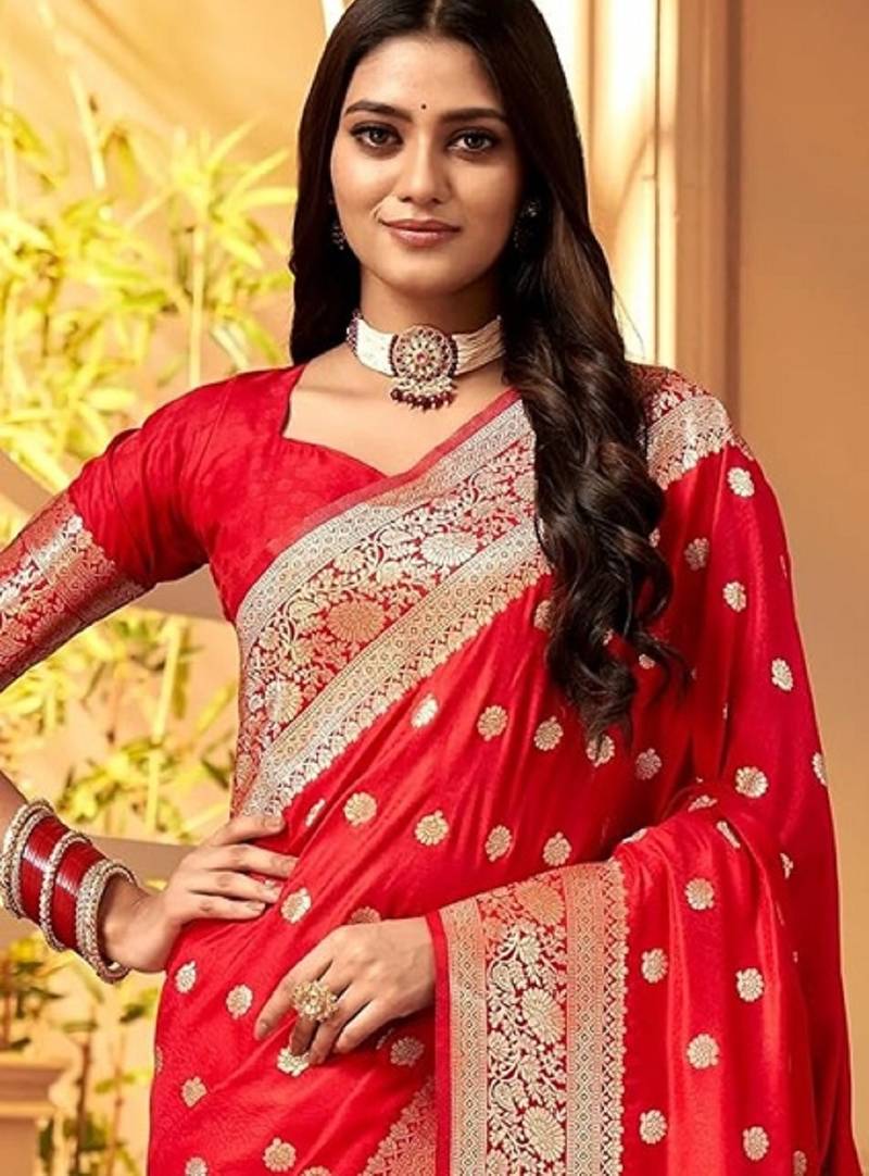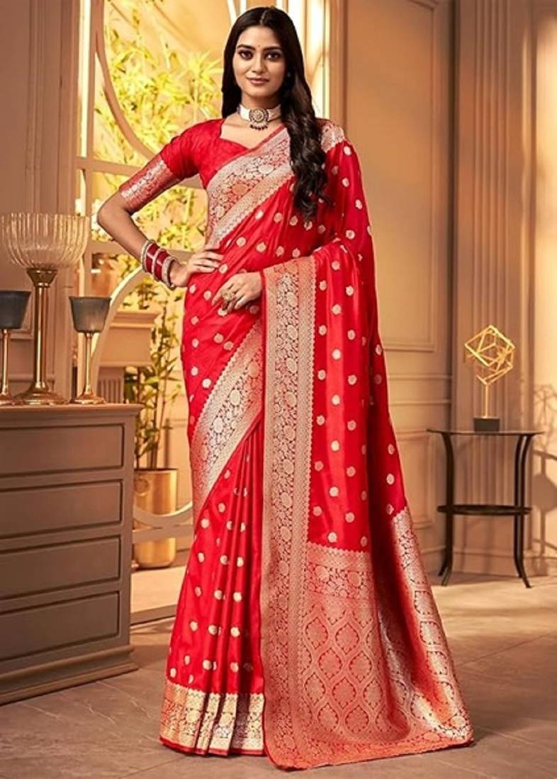 Red soft silk blend banarasi jacuard work designer party wear saree with unstitched blouse piece